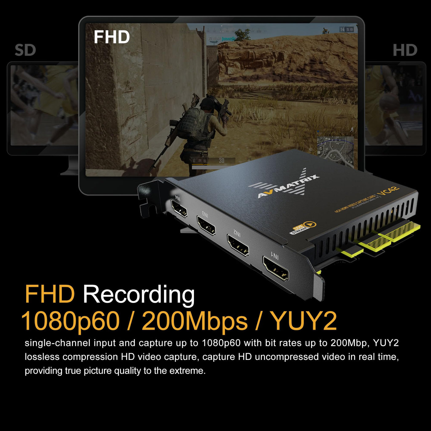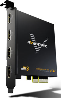 Q: What are the main features of the AVMATRIX VC42 capture card?A: The AVMATRIX VC42 capture card supports 4 channels of HDMI input, allowing simultaneous capture from multiple devices such as game consoles and cameras. It records in 1080p60 resolution with bit rates up to 200Mbps and features ultra-low latency due to its PCIE GEN 2 interface. This card is compatible with various streaming platforms and operating systems, making it versatile for live streaming and recording.