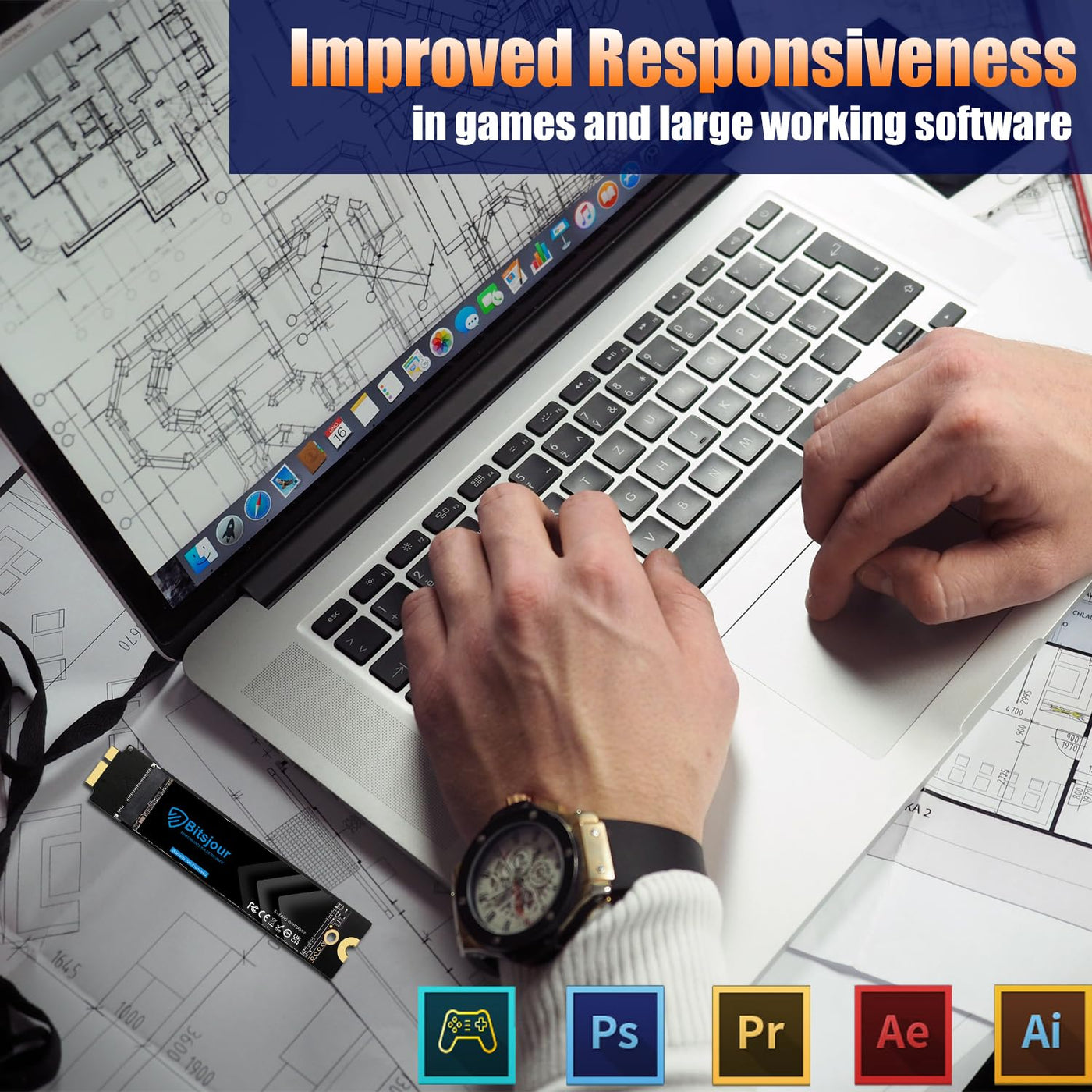 Q: How fast is the Bitsjour SSD in terms of read and write speeds?A: This SSD offers impressive performance with read speeds up to 520 MB/s and write speeds up to 480 MB/s, enhancing your MacBook's overall speed and efficiency.