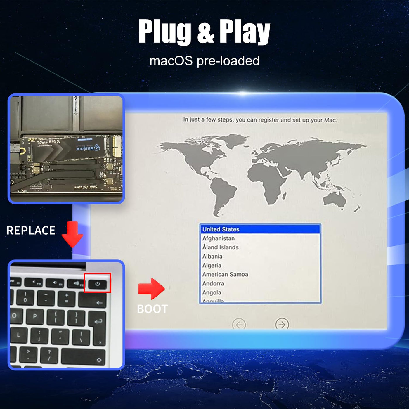 New Life For Your Mac! Why Buy An Expensive New Computer? With Capacities Of Up To 2Tb, Fast Transfer Speed, Short Loading Times, Long Endurance, Low Power Consumption Than The Old Ssd, The Bitsjour Nvme Ssd Is The Perfect Drive To Upgrade Your Macbook. This Internal Ssd For Macbook Replacement Use Nvme Pcie 3.0 Tech, 3D Tlc Nand Flash And Premium Components, Performing Up To 2250 Mb/S For Read And 1850 Mb/S For Write. Upgrade Your Macbook With Bitsjour Nvme Pcie Ssd, Decrease Boot Times, Store And Access Files At Lightning Speed. This Not Only Save Your Time But Also Made Your Laptop Run More Efficiently And Smoothly When Running Various Applications And Games. Note: Speed Is Based On Internal Test Results. The Larger The Capacity, The Faster The Speed. Transfer Speed Varies By Capacity, Hardware Configuration And Test Platform. This Ssd Hard Drive Is Designed To Replace The Internal Ssd In Macbook Air/Imac From 2013 To 2017, Macbook Pro From 2013 To 2015. No Extra Adapter Needed, Fit Perfectly On Your Macbook, Faster Speed And Stable Performance. Setup Is A Breeze Note: The Macbook Must Be Updated To Macos 10.13 Or Later Version Before Removing The Old Disk. * 2 Torx Screwdrivers (T5 And T6) That Will Enable You To Remove The Macbook Case And The Old Ssd Easily. * 1 Ssd Drive Pre-Installed With Macos. Plug And Play. No Need To Worry About Installation Issues And Downloading A New Operating System. Note: This Ssd Only Work With Dedicated Portable Ssd Enclosure For Macbook. It Will Not Be Recognized If You Install This Macbook Ssd Into A Normal Ssd Enclosure.