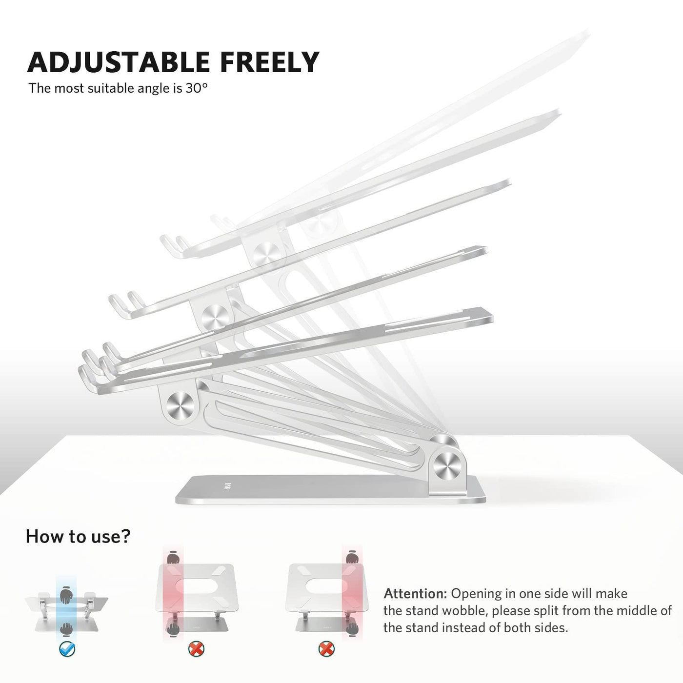 Adjustment: The Laptop Stand Is Made Of Sturdy Alloy Steel, You Can Incline At Different Angles And Stand It Up Higher Or Lower Depending On Your Needs. | Steadiness: With The Metel Material, This Tablet Stand Is More Stylish And Long-Lasting. 4 Slide-Proof Silicone Pads On The Bottom Keep The Stand From Sliding. | Ergonomics: The Z-Type Design Is Good For Adjusting An Ideal Height For Typing, Watching And Sitting Properly While Supporting Your Back And Neck With A Comfortable Posture. | Ventilation: It Has A Hole On The Surface Which Is To Cool Down Your Laptop By Providing More Air Flow Than If It Were Laying Flat On The Table. The Entire Stand Is Made Of High Quality Metal, It Can Absorb And Discharge Heat Easily. | Compatibility: The Laptop Stand Fits A Variety Of Laptops, Compatible For Macbook/ Macbook Pro/ Hp/ Lenovo Laptops Up To 17 Inches, Etc.