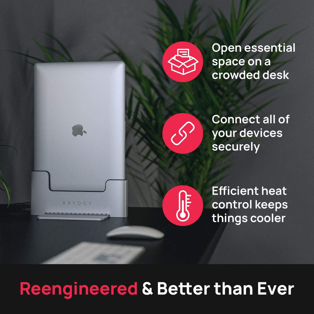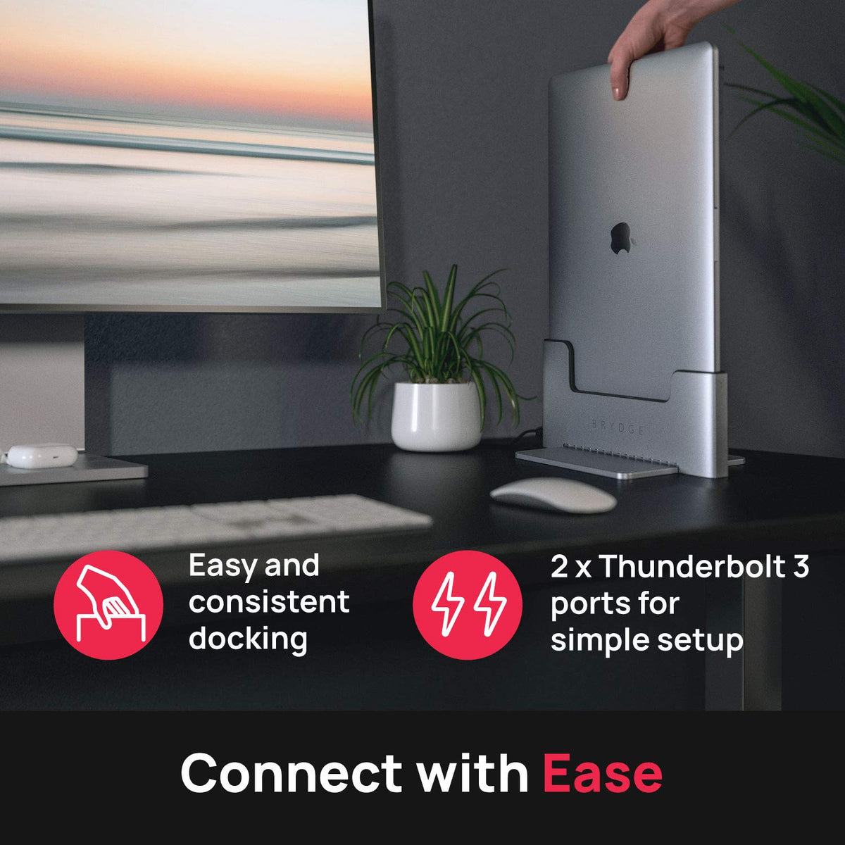 Q: How does the vertical docking station help save space on my desktop?A: The vertical design of the Brydge Laptop Stand allows you to store your MacBook Pro upright, freeing up valuable desk space. This setup is ideal for home offices, media centers, or conference rooms.