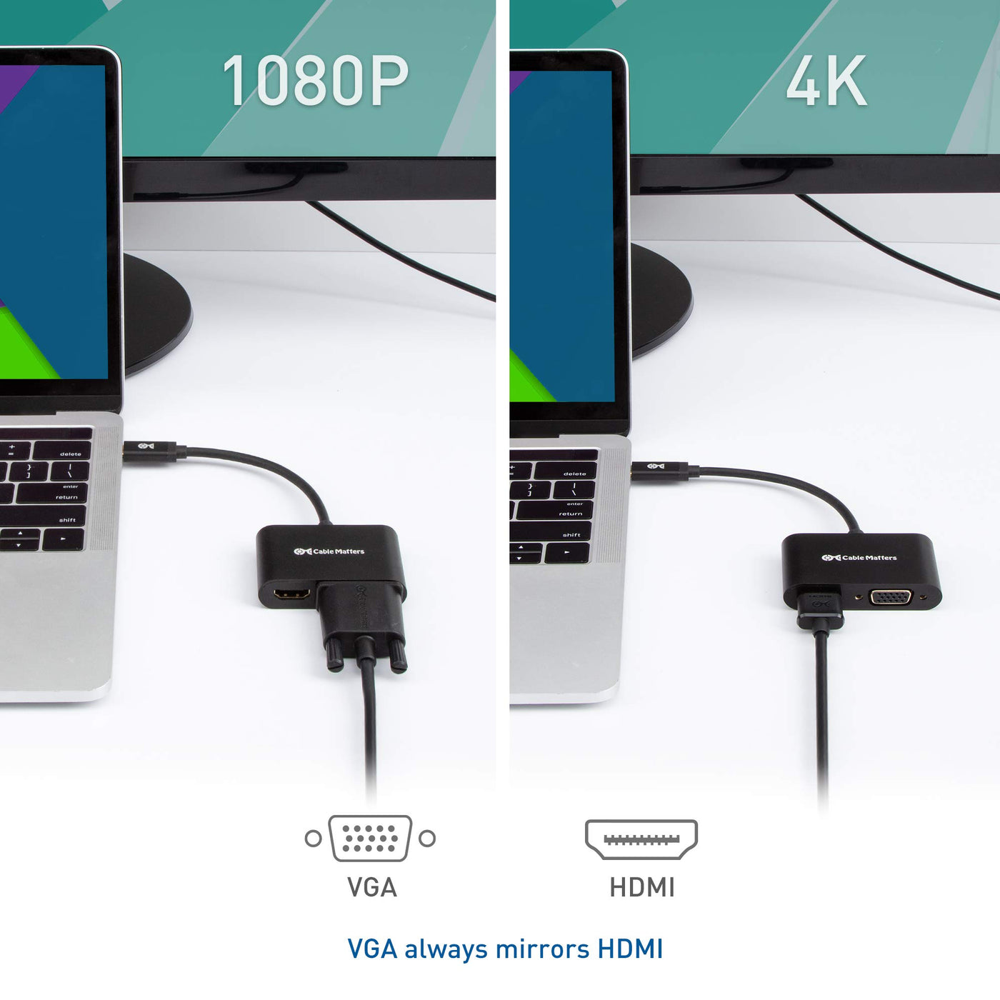 Connect More With Cable Matters Usb-C Products Usb-C Laptop Companion The Cable Matters Usb-C To Hdmi Or Vga Adapter Provides A Choice Of Vga Or Hdmi To Connect A Display To A Thin Laptop With A Usb-C Or Thunderbolt 3 Port. Video Choice Award Connect A Single Display With Hdmi, Or Vga. Always Be Prepared To Connect To An Available Uhd Tv, Monitor Or Projector When Traveling. Usb-C &Amp; Thunderbolt 3 Compatible Thunderbolt 3 Equipped Computers Use A Usb-C Port To Connect Thunderbolt 3 Compatible Equipment. Important Notes - Only 1 Display Can Be Supported At A Time. Connect Only The Active Display Cable. - Usb-C Port Of Host Requires Displayport Alternate Mode Support To View Video Over Usb - Directly Connect The Adapter To The Host Device - An Hdmi Or Vga Cable (Sold Separately) Is Required Warranty Limited One-Year Warranty And Lifetime Product Support