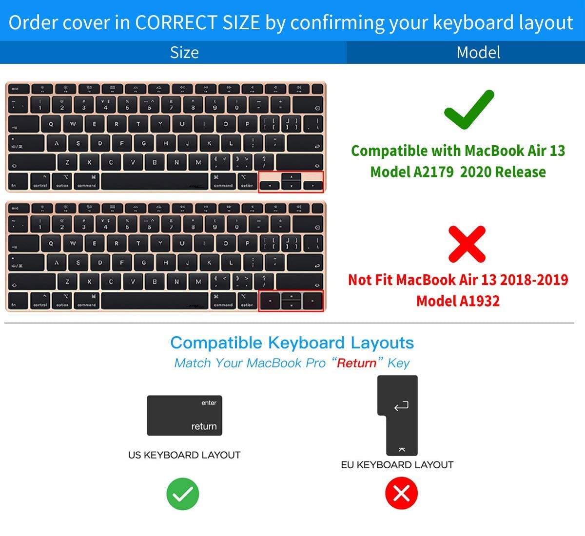 Q: How do I ensure that I am purchasing the right keyboard cover for my MacBook?A: To find the right fit, confirm that your MacBook Air model is either A2179 or A2337. Additionally, ensure your keyboard layout matches the US ANSI layout, which features a rectangular 'Enter' key. If your 'Enter' key is shaped like a '7', this cover will not fit.