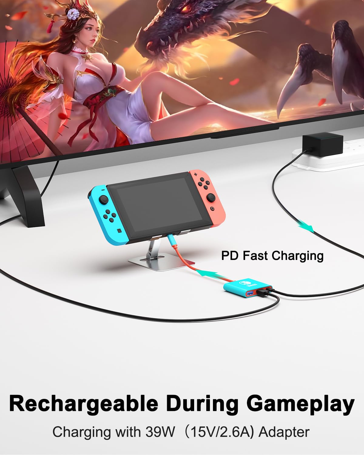 Q: Can I charge my Nintendo Switch while using the Dnkeaur Dock?A: Yes, the Dnkeaur Switch Dock allows for passthrough charging, so you can charge your Nintendo Switch while playing, provided you use the original charger.