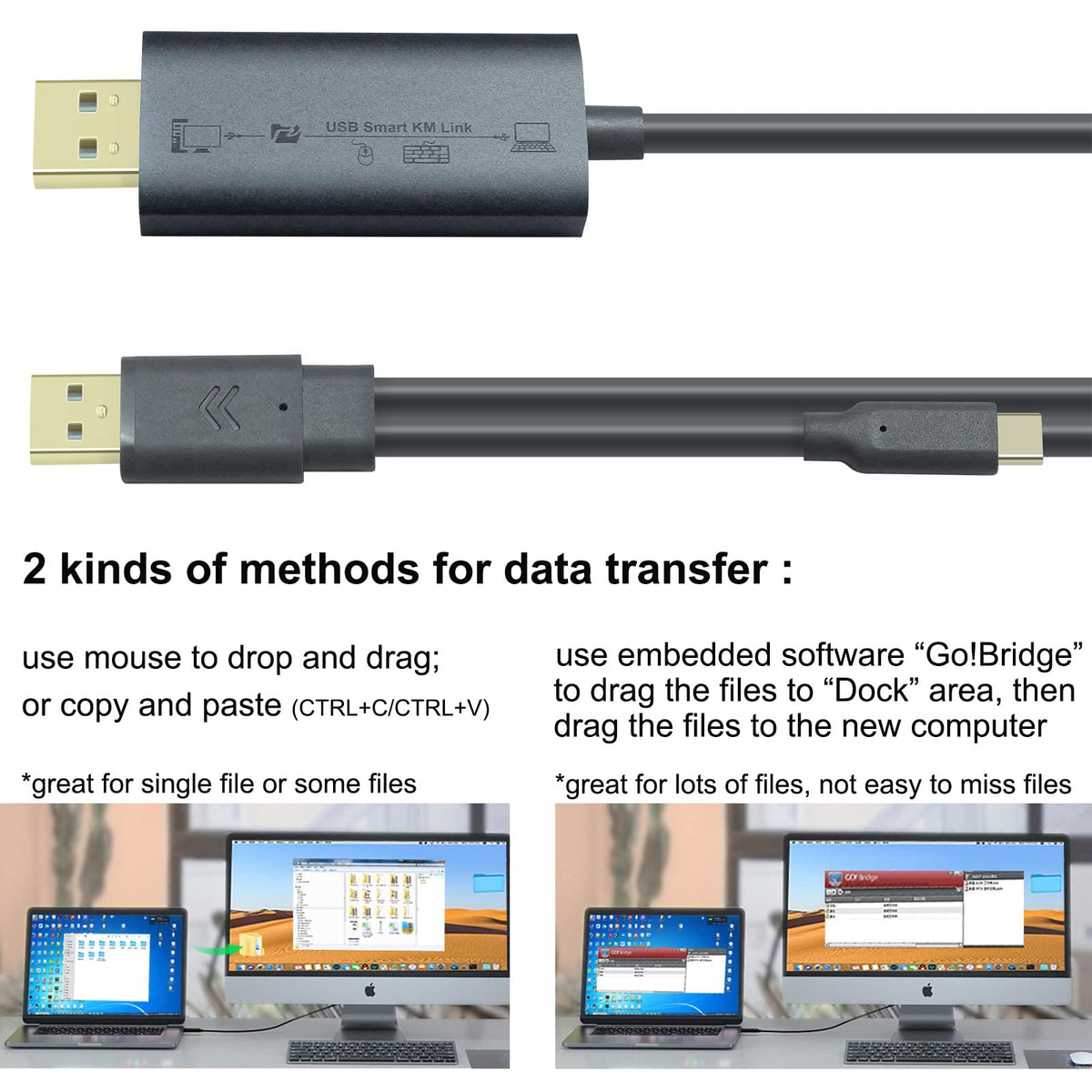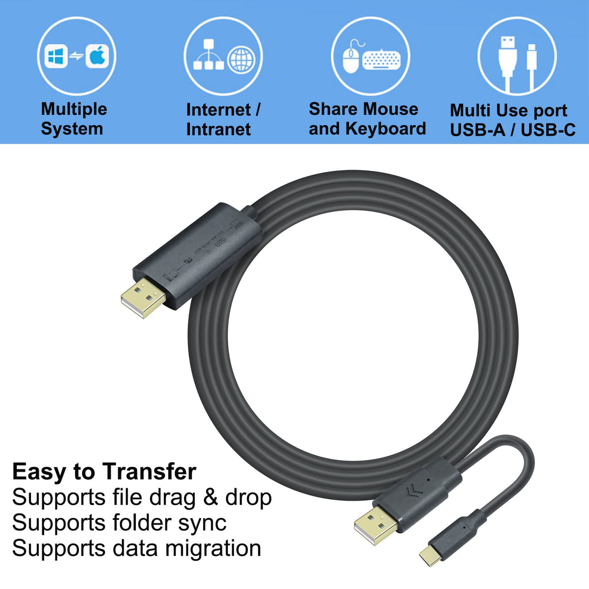Easy Way To Transfer Files Between Pc And Mac 2 Computers Can Directly Be Connected By Usb To Usb Bridged Cable (Also Called Usb Networking Cable), To Handle Multiple Transfers From An Old Computer To New Computer, Usb Data Link Cable Is A Quick And Simple Way To Migrates And Transfers Data From Laptop To Laptop. Easy Computer Sync Software Included : The Usb Transfer Cable Has Embedded Driver, After Completing The Software Installation On Both Pcs, The Pcs Will Be Able To Talk To Each Other. It Supports 2 Pcs Without Networking, Bidirectional High Speed Data Copy. Time Saver, Improve Work Efficiency: 6Ft Laptop Transfer Cable Is Faster Than Using Portable Hard Drives Or Cloud-Based Solution, Since The Copy And Paste Is Happening Simultaneously From Pc To Pc. Cross-System Operation From Windows To Windows (32-Bit And 64-Bit), Windows To Mac, Mac To Mac; For Windows 11 10 8.1 8 7, Vista, Xp, Mac Os 8 / 9, Os-X, . For Laptop, Desktop Computer, Tablet, Cell Phone That Has Usb A And Usb C Port; 2 Pcs Share A Set Of Mouse And Keyboard To Use Both Of Screens For Graphic Design, Engineering Design, Etc.; Easy Exchange Of Files Between Intranet And Internet Computers How To Use: Plug The Computer Transfer Cable To Both Pcs, The Built-In Driver Will Pop-Up On Both Pcs Windows, Simply Click For Proceed Installation. How To Switch Between 2Pcs? It Has 2 Ways: - Use Mouse To Roll Over Monitor, Mouse Arrow Will Jump From First Pc Monitor To Second Pc Monitor, Now You Can Control Second Computer. - Set Up Your Own Hot Key, After You Click Hot Key, First Pc Mouse Arrow Will Jump To Second Pc. Note:6 Feet Usb Cable Is Not For Transferring Apps And Program Connectors: Dual Usb Type A Male Port, 1X Usb Type C Port Usb 2.0 And Usb 1.1 Compatible Whats Included 1X Usb Computer To Computer Cable 6 Ft