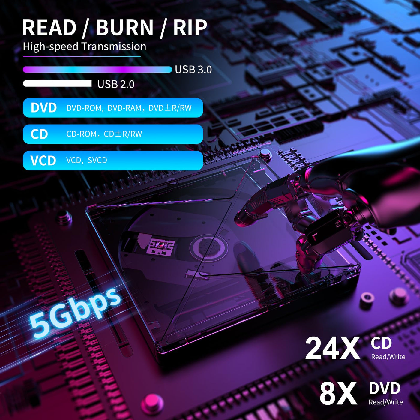 Plug-And-Play Convenience: Our External Cd/Dvd Drive Offers Effortless Setup - Simply Plug Into A Usb 3.0 Port For Instant Recognition, Eliminating The Need For Additional Drivers. Enjoy Seamless Connectivity And Immediate Access To Your Discs Without Any Hassle. High-Speed Data Transfer: Experience Lightning-Fast Data Transfer With Usb 3.0 Technology, Ensuring Swift Performance For Reading, Writing, And Burning Cds/Dvds. Maximize Efficiency And Productivity With Rapid Data Transmission Rates, Enhancing Your Overall User Experience. Wide Compatibility: Our Drive Is Compatible With Various Devices And Operating Systems, Including Windows, Mac, And Linux. Whether You'Re Using A Laptop, Desktop, Or Notebook, Our Drive Seamlessly Integrates With Your Setup, Offering Versatile Functionality Across Different Platforms. Durable Yet Portable Design: Crafted With Durability In Mind, Our Drive Features A Robust Construction To Withstand Everyday Use. Despite Its Sturdy Build, It Remains Lightweight And Portable, Making It Ideal For On-The-Go Use. Take Your Drive Wherever You Go And Enjoy Reliable Performance Wherever You Are. Versatile Functionality: Beyond Its Role As A Cd/Dvd Reader And Burner, Our Drive Doubles As A Usb Hub, Providing Additional Connectivity Options For Your Devices. With Versatile Functionality, You Can Easily Transfer Files, Connect Peripherals, And Expand Your Device'S Capabilities, All In One Convenient Package.