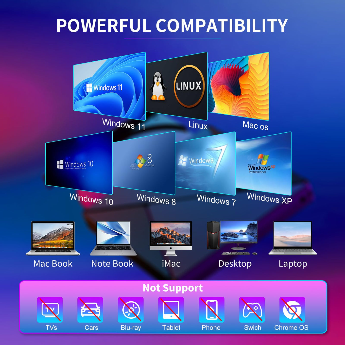 Q: Can I use this DVD drive with Windows 98 or my tablet?A: No, this DVD player is not compatible with Windows 98, iPads, or tablets. It also does not support Chrome OS, TVs, Blu-ray, 3D, 4K discs, or gaming consoles like PS4/5 and Xbox.
