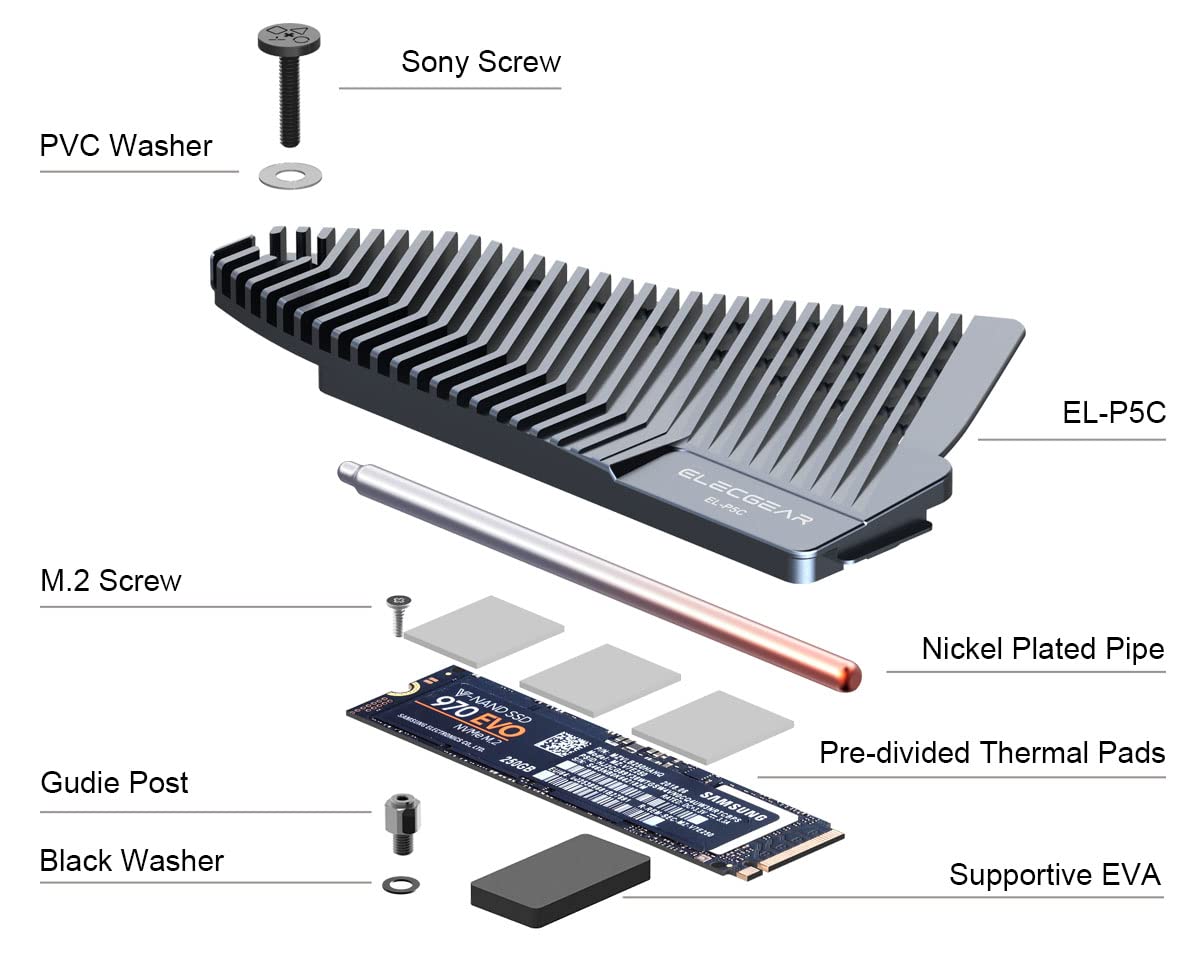 Elecgear Ps5 Nvme Ssd Heatsink, El P5C Heat Pipe + Solid Aluminum Cooler For Playstation 5 Internal Pcie M.2 Nvme 4.0 Gen4 Gaming Memory, Thermal Pads And Re Designed Ssd Mounting Post Kit