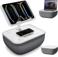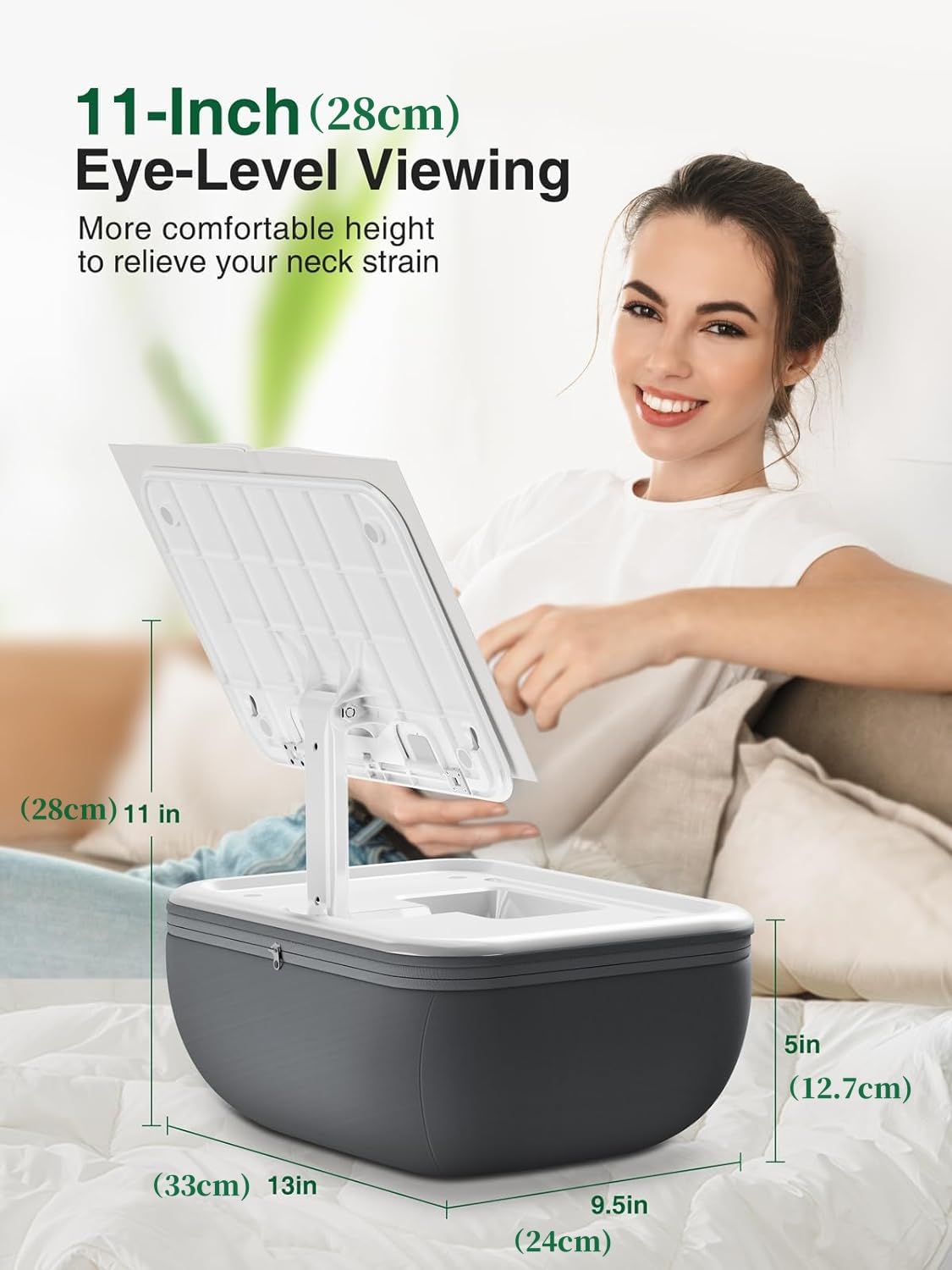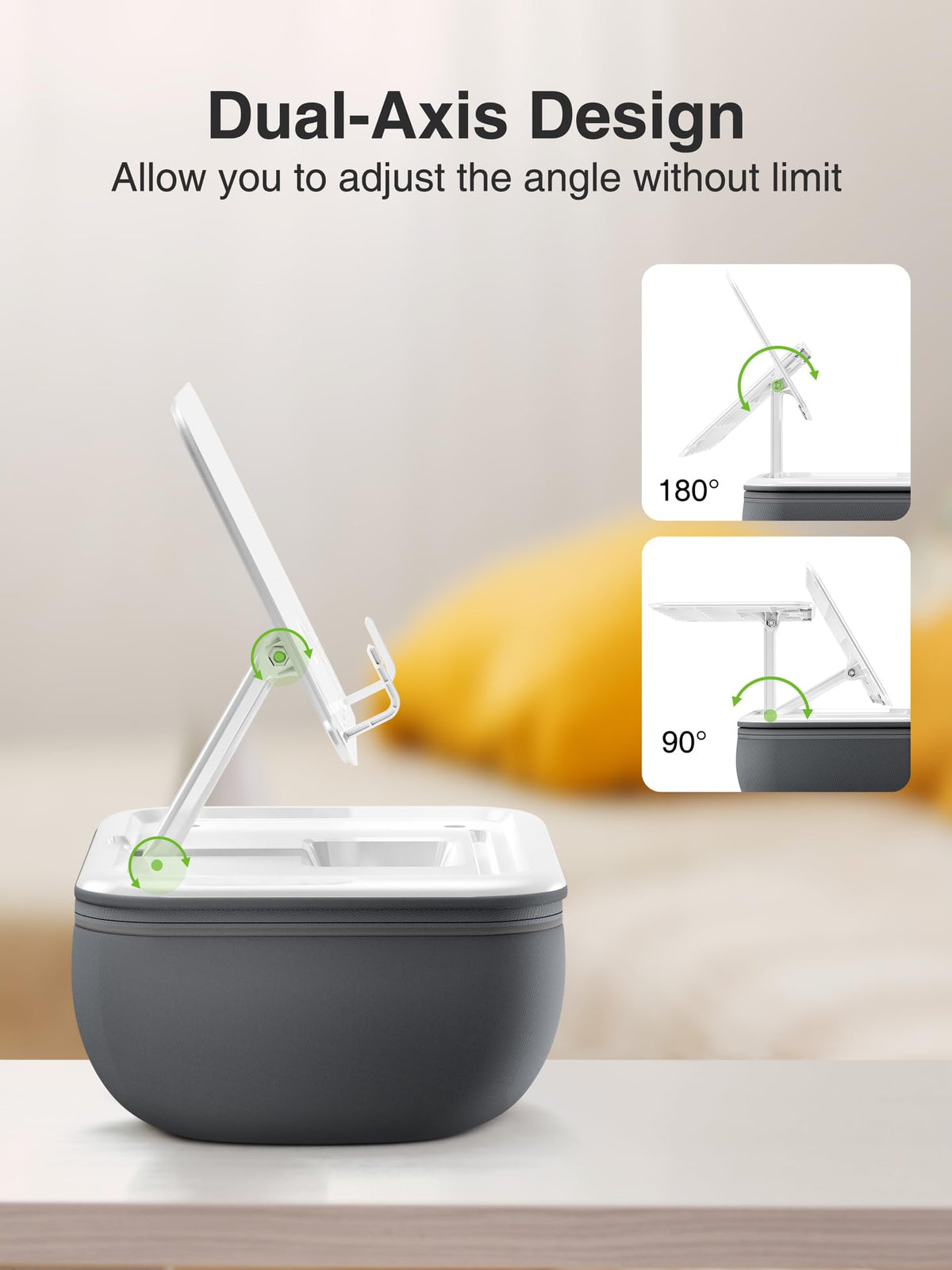 Q: How does the angle adjustment feature work on this tablet pillow stand?A: The tablet pillow stand features a dual-axis design that allows users to adjust the angle and height of their device without limits. It can be raised up to 14 inches, supporting both horizontal and vertical viewing for optimal comfort.