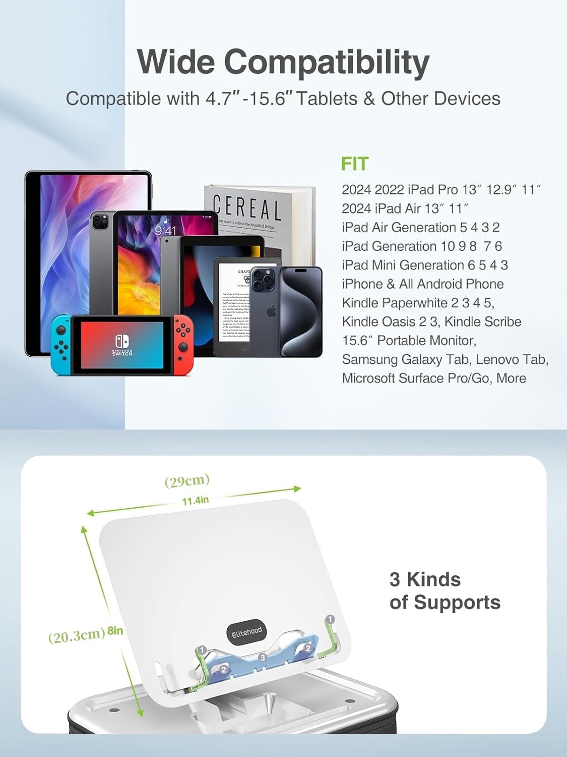 Q: What devices are compatible with the elitehood iPad Pillow Stand?A: The elitehood iPad Pillow Stand is compatible with a wide range of devices, including all laptops and tablets from 4.7" to 15.6". This includes popular models like MacBook, iPad Pro, iPad Air, Kindle Fire, and many more.