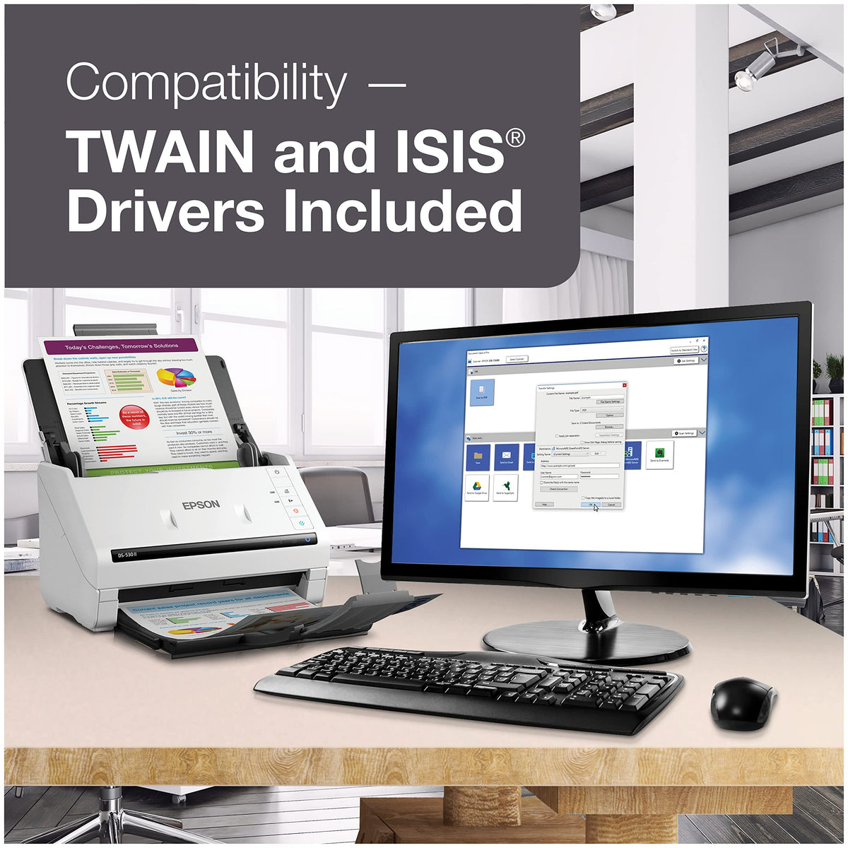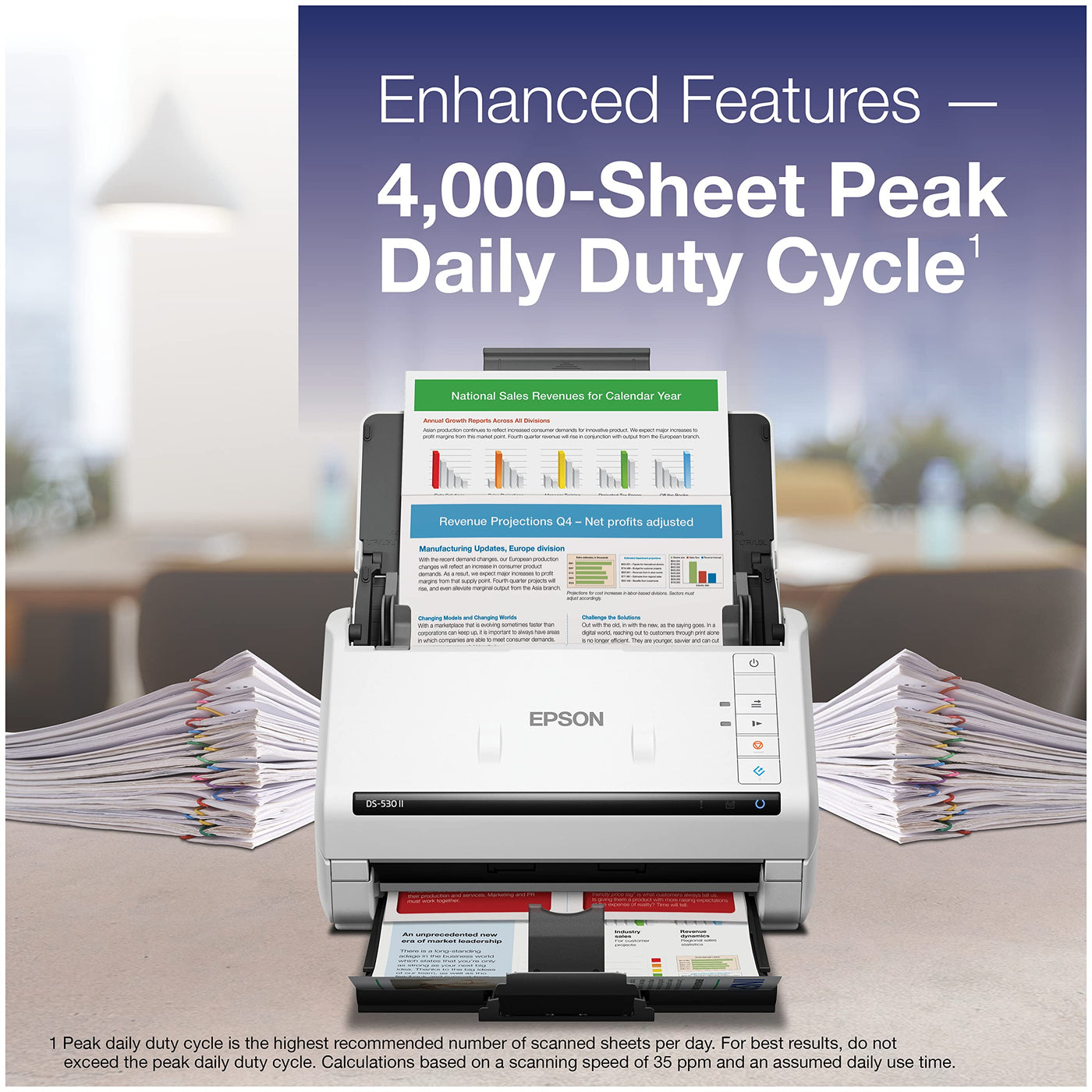 The Epson Ds-530 Ii Color Duplex Document Scanner Is The Smart Choice For Business Document Management, Offering Fast, Efficient Performance Featuring Speeds Up To 35 Ppm70 Ipm, This Powerful, Compact Performer Offers A Peak Daily Duty Cycle Of Up To 4,000 Sheets And Includes Twain And Isis Drivers For Seamless Integration With Most Existing Document Management Systems Advanced Paper Feed And Auto Document Feederadvanced Paper Feed Technologies Such As Blank Page Removal, Auto-Rotation, Auto-Cropping, Dirt Detection, And Paper Protection Help Enhance Productivity, While A 50-Page Auto Document Feeder Saves Time And, It Comes With An Industry-Leading 3-Year Limited Warrantyslow Speed Modeenhanced Features Include Slow Speed Mode, Programmable Jobs, And A Peak Daily Duty Cycle Of Up To 4,000 Sheetsfast Scan Speedsthis Document Scanner Can Scan Paper At Up To 35 Ppm70 Ipm And Offers A Peak Daily Duty Cycle Of Up To 4,000 Sheetseasy Integrationthis Scanner Also Includes Twain And Isis Drivers That Enable Easy Integration With Existing Software
