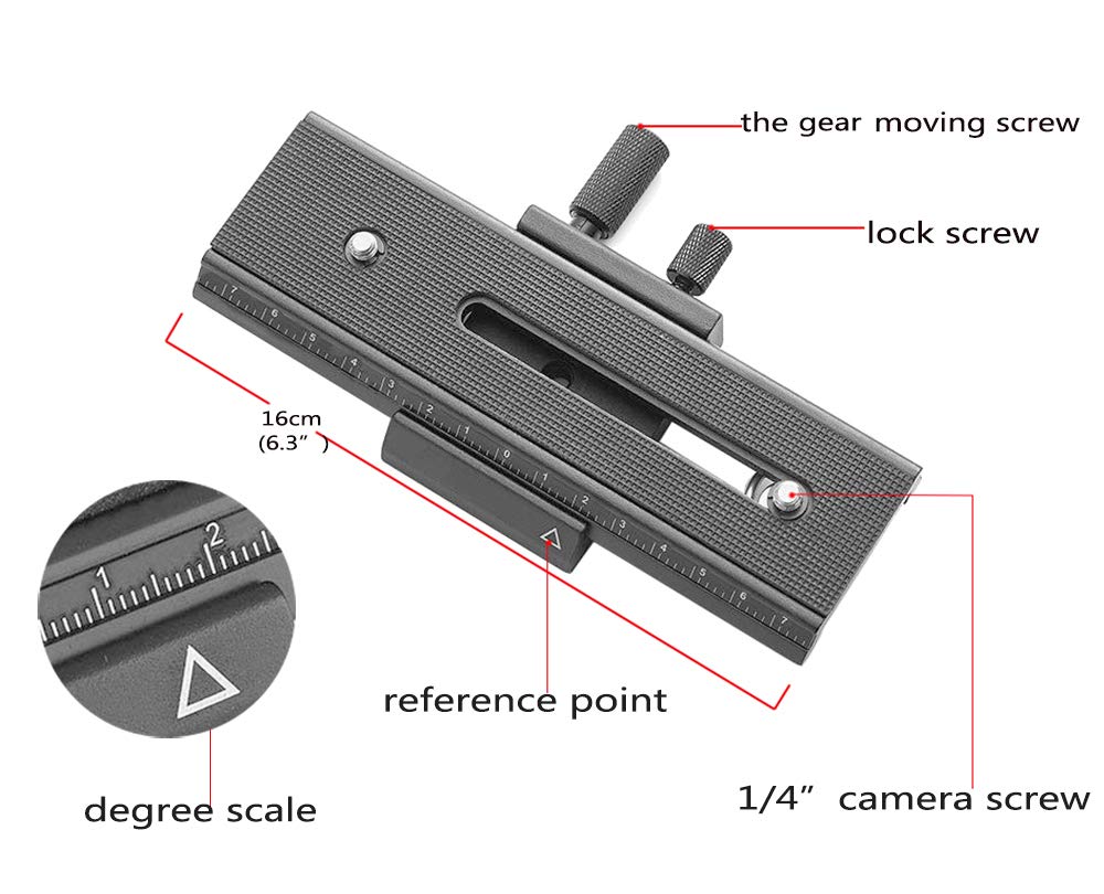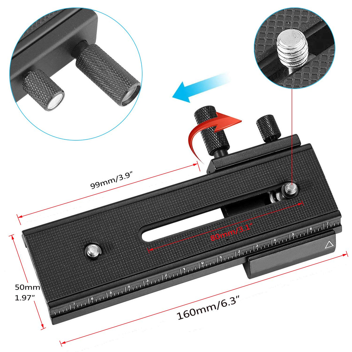Features: -Micro Focusing Rail Slider Plate Is The Ideal Tool To Make Precise Positioning Movements To Achieve The Perfect Framed Shot,For Macro Photography,Film Negatives Taken And Close-Up Shooting. -This Plate Has Scale And Finger-Tip Control For Ultra-Fine Positioning, Also Has A Simple Lock-Release Lever For Fast Set-Up. -This Micro Focusing Rail Slider Plate Support Movement Of 2 Directions---Forward, Back. -1/4'' Male Thread Screw Compatible With Most Dslr Or Dc. -1/4'' Female Thread Screw Can Be Attached To Tripod Head Or Other Compatible Devices. -An Ideal Accessory For Precise Adjustments When Used With Tripods For Macro Photography, Or Film Negatives Taken. Specifications: -Material: Aluminum Alloy -Weight: 225G -Color: Black -Item Size:160Mmx93Mm/6.3''X3.7''(L*W) -Move Range: 80Mm/3.1'' Package Includes : 1X 2 Way Focusing Rail Slider