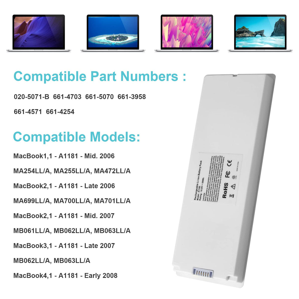 Q: Is the Fancy Buying A1185 Laptop Battery compatible with my MacBook model?A: Yes, the Fancy Buying A1185 Laptop Battery is compatible with several MacBook models, including MacBook1,1 - A1181 (Mid 2006), MacBook2,1 - A1181 (Late 2006), and MacBook5,2 - A1181 (Early 2009), among others. Please refer to the compatibility list provided in the product description for a complete overview.