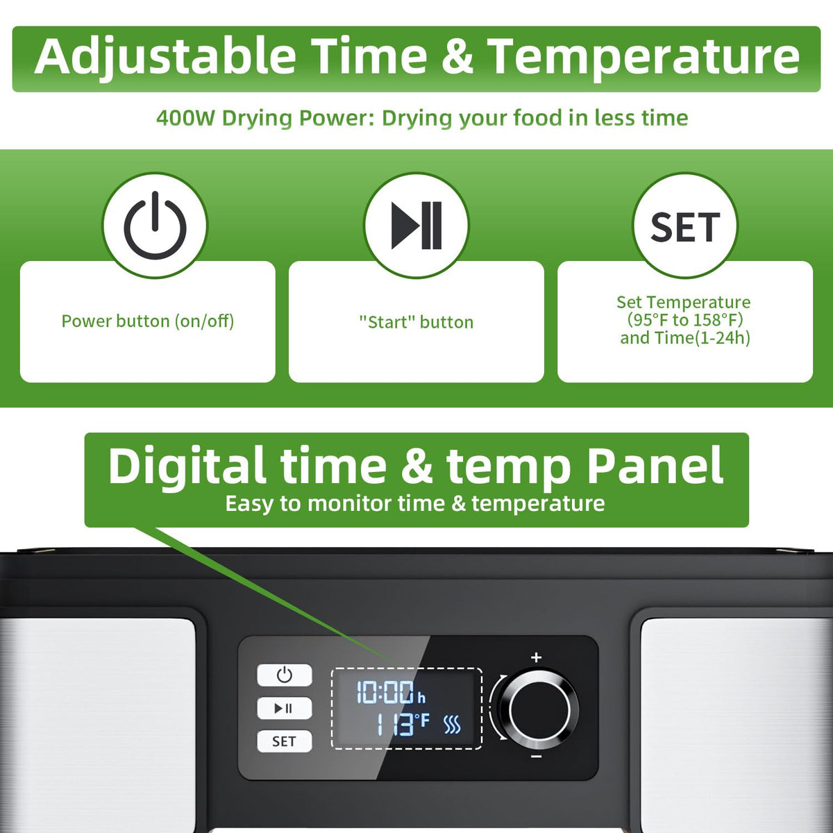 Q: How do I adjust the temperature and time for dehydrating food?A: The food dehydrator features a user-friendly LED display that allows you to easily set the drying time from 1 to 24 hours and adjust the temperature between 95°F and 158°F (35°C to 70°C), ensuring optimal dehydration for different food types.