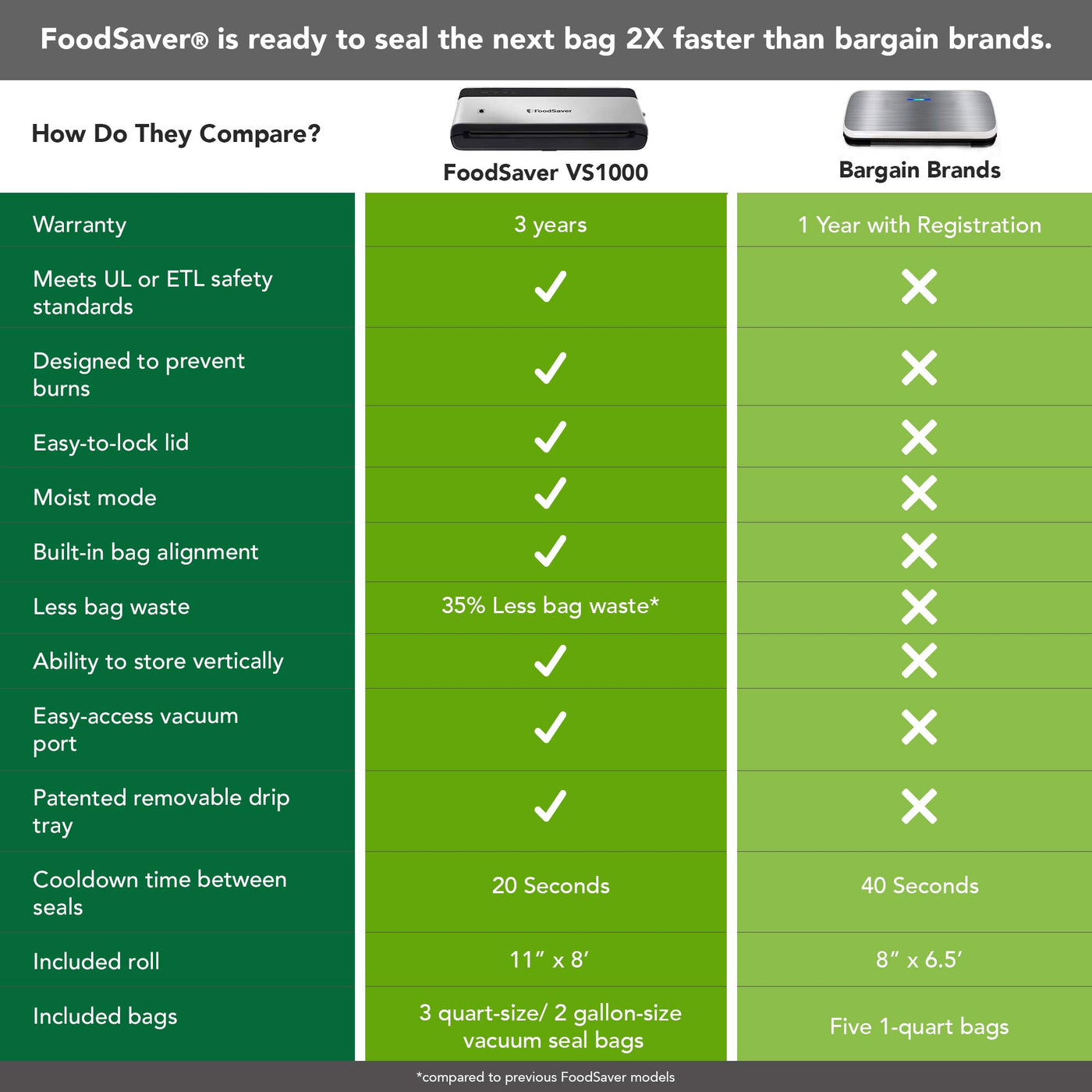 The Foodsaver Powervac Vacuum Sealer Is An Efficient, Compact Unit That Extends The Freshness Of Your Food Up To 5 Times Longer Than Traditional Storage Methods. It Also Helps Prevent Freezer Burn. With Its Modern, Vertical Storage Design, It Maximizes Your Kitchen Space While Providing The Reliable Performance You Expect From Foodsaver. Our Model Creates A Robust, Airtight Seal And Yields 35% Less Bag Waste Compared With Earlier Models. It Offers Two Custom Settings�Dry And Moist�For Optimal Sealing, Regardless Of Food Type, And Is Compatible With All Foodsaver Accessories.