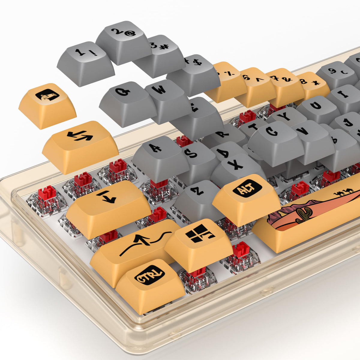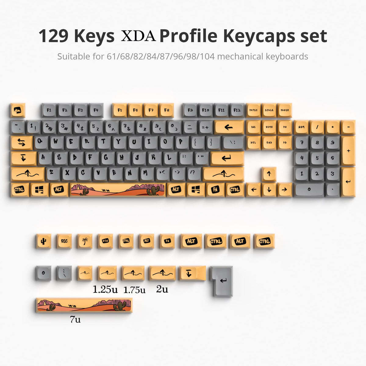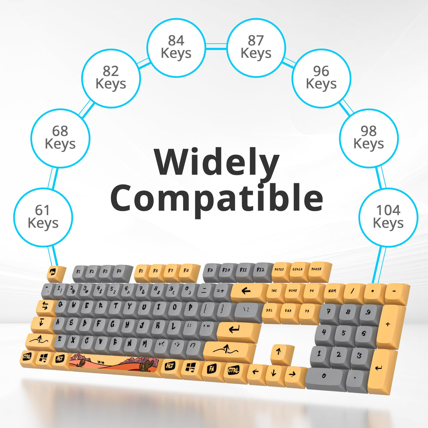 The Inspiration Behind This Theme Keycaps Set Came From The Desert And The Yellow . ?Desert Custom Caps Cover Design?: A Complete Size Keycaps Set Of Us Ansi Layout, Including Keycaps To Cover Various 60%,65%,75%,85% And Full-Size Mechanical Keyboards. The Desert Custom Keycaps Part Is Made Of Esc/Backspace/Enter/Arrow Key And Some Extra Cute Element Pattern 1.0U Keycaps. ?Note?: Only Sell Keycaps!!! The Keyboard In The Picture Is Only For The Demo And Is Not For Sale.