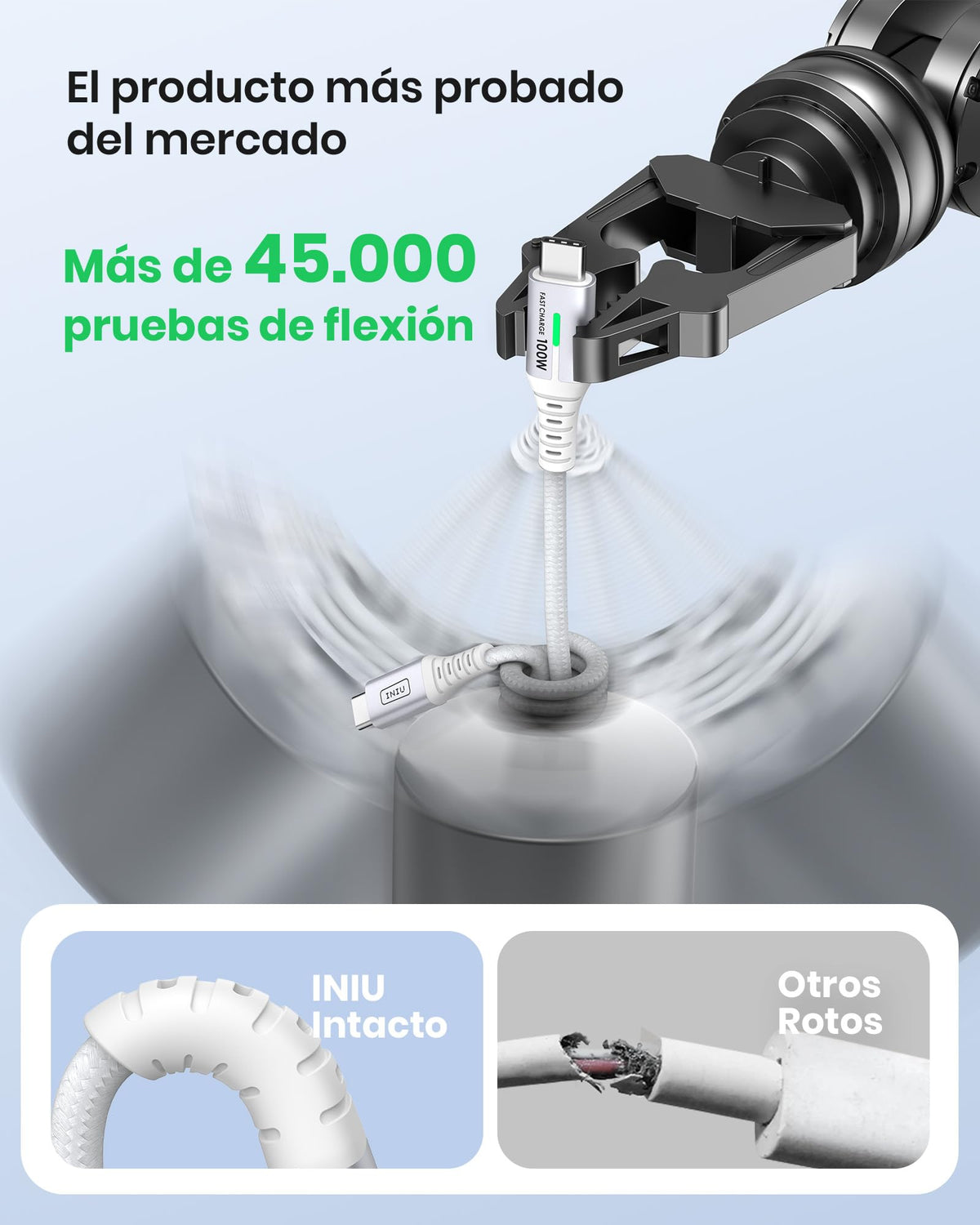 Q: What makes the INIU cable more durable than standard cables?A: The INIU cable features an exclusive flyweave braided nylon coating and flexible anti-rupture SR joints, allowing it to withstand over 45,000 bends, making it significantly more durable than standard cables.