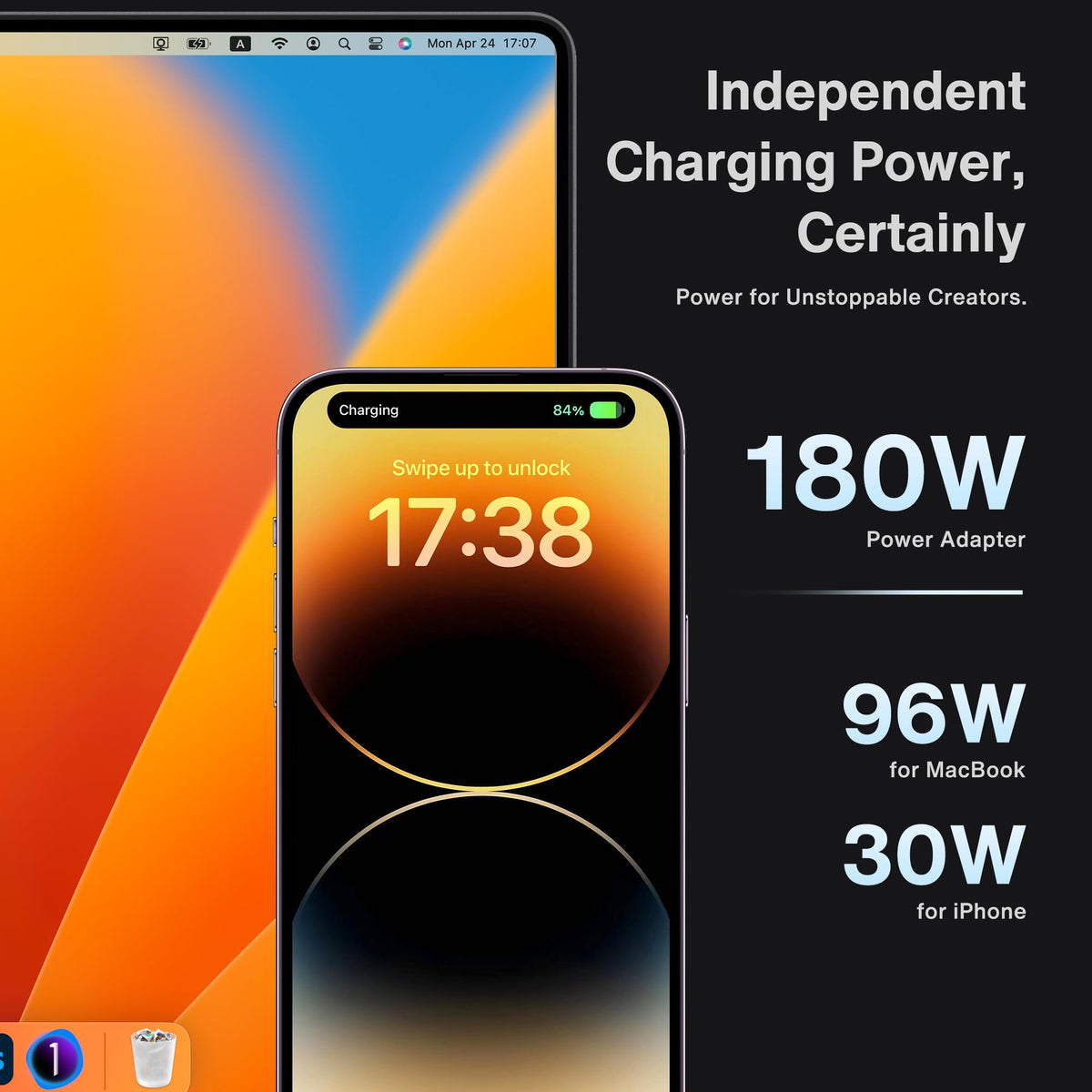 Q: What is the maximum power output for charging devices with this docking station?A: This docking station includes a 180W power adapter, providing efficient charging capabilities of up to 96W for laptops and up to 20W for PD USB-C devices, ensuring your devices are charged quickly and safely.