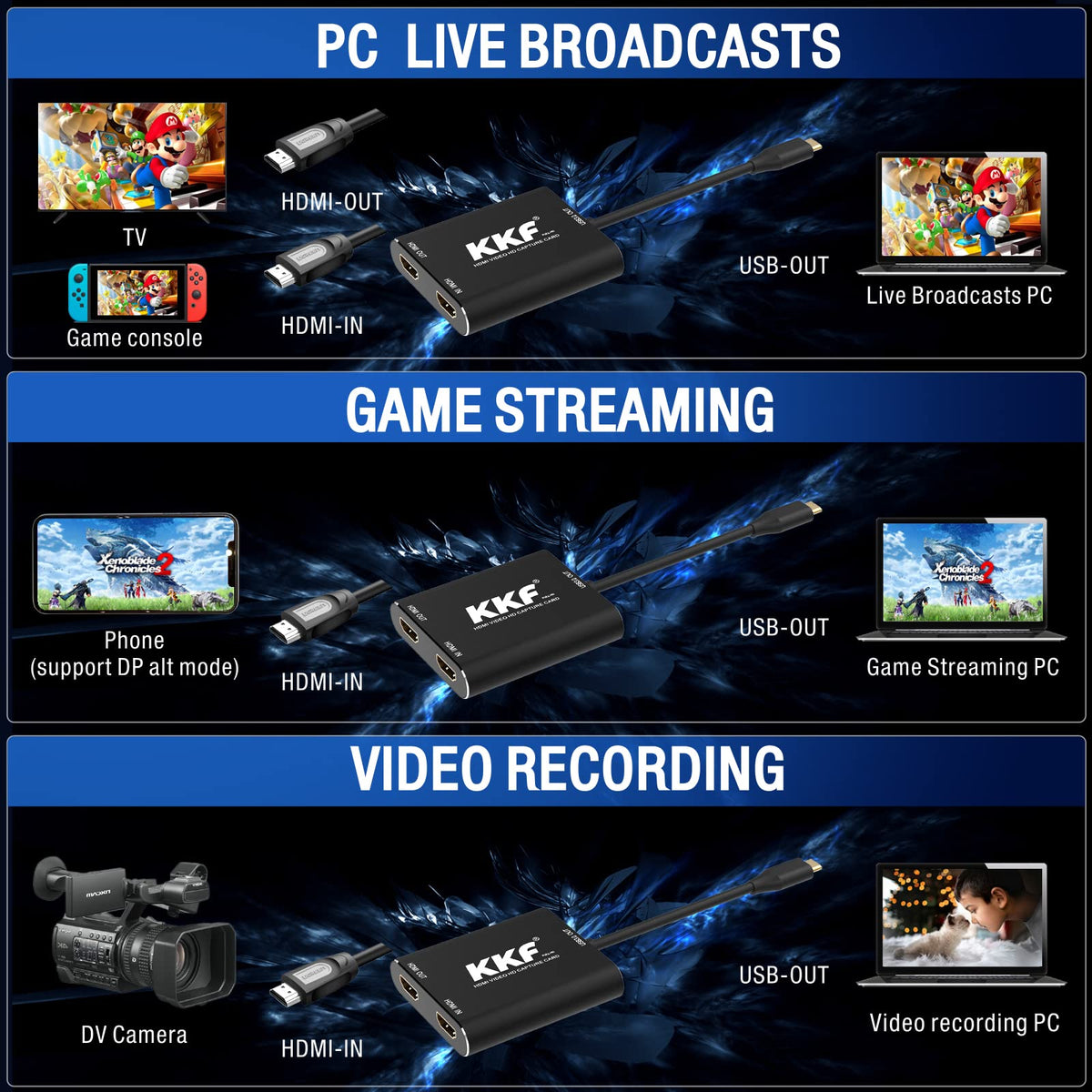 Q: How does the Type C interface enhance performance?A: The Type C interface of the KKF Capture Card provides extremely fast data transmission speeds, which is crucial for recording and streaming high-quality video without lag.