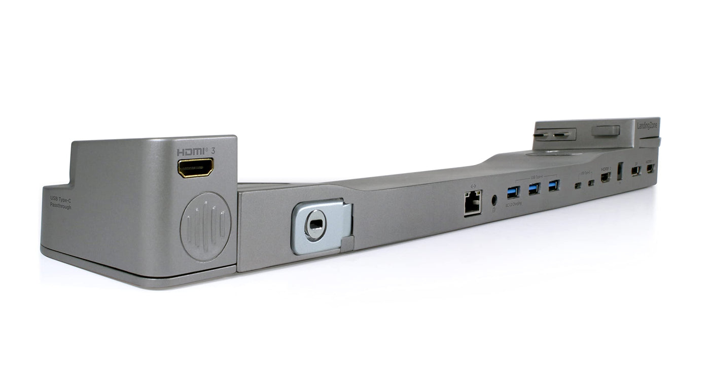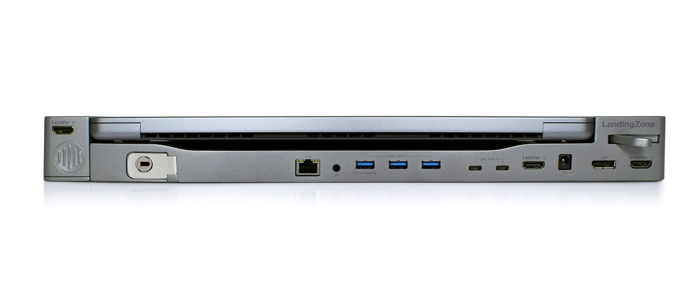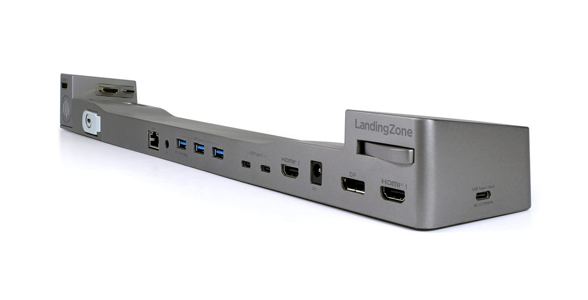 Q: What types of ports does the LandingZone Docking Station offer?A: The LandingZone Docking Station includes a variety of ports: HDMI 1 Port & DisplayPort Combo (choose one), HDMI 2 port, HDMI 3 port, USB Type-C Passthrough port, USB 3.2 Gen 2 Type-C port, 2x USB 3.2 Gen 1 Type-C ports, 3x USB 3.2 Gen 1 Type-A ports, Gigabit Ethernet, Two-Way Audio Jack, and a Kensington Security Slot.