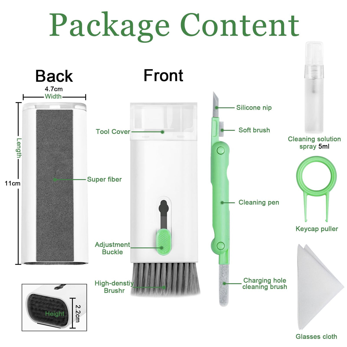 Q: What cleaning tools are included in the walrfid Laptop Screen Keyboard Earbud Cleaner Kit?A: The walrfid cleaning kit includes a cleaner pen for AirPods with silicone and plastic nips, a flocking sponge, a high-density retractable keyboard brush, a key puller, soft plush glasses cleaning cloth, and a screen cleaner solution spray.
