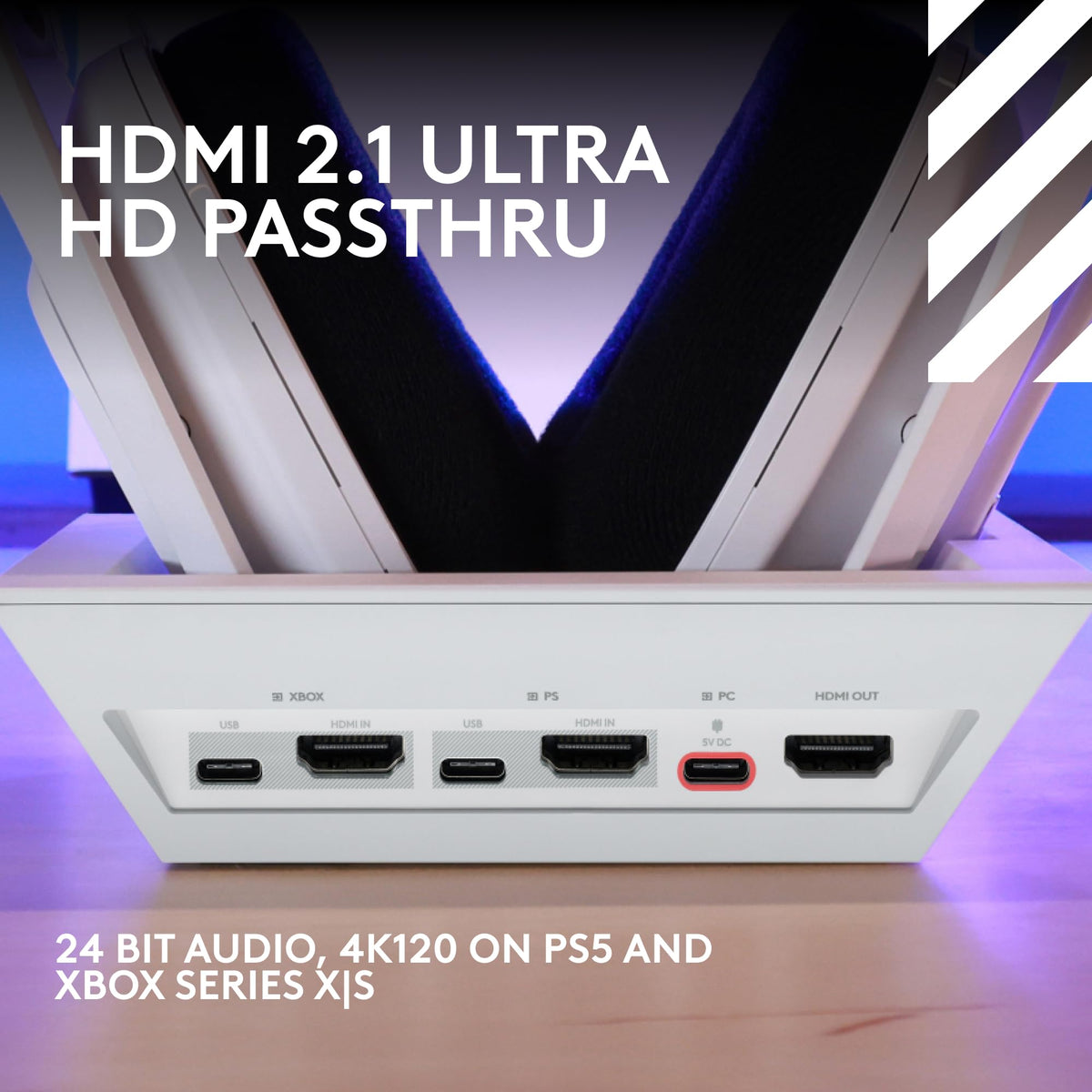 Q: What is HDMI 2.1 Passthru and how does it benefit gaming?A: HDMI 2.1 Passthru on the A50 X enables Ultra HD resolution, supporting 4K at 120Hz and 24-bit audio fidelity. This feature ensures that you experience the highest quality visuals and sound when gaming on compatible consoles, enhancing your overall gaming experience.
