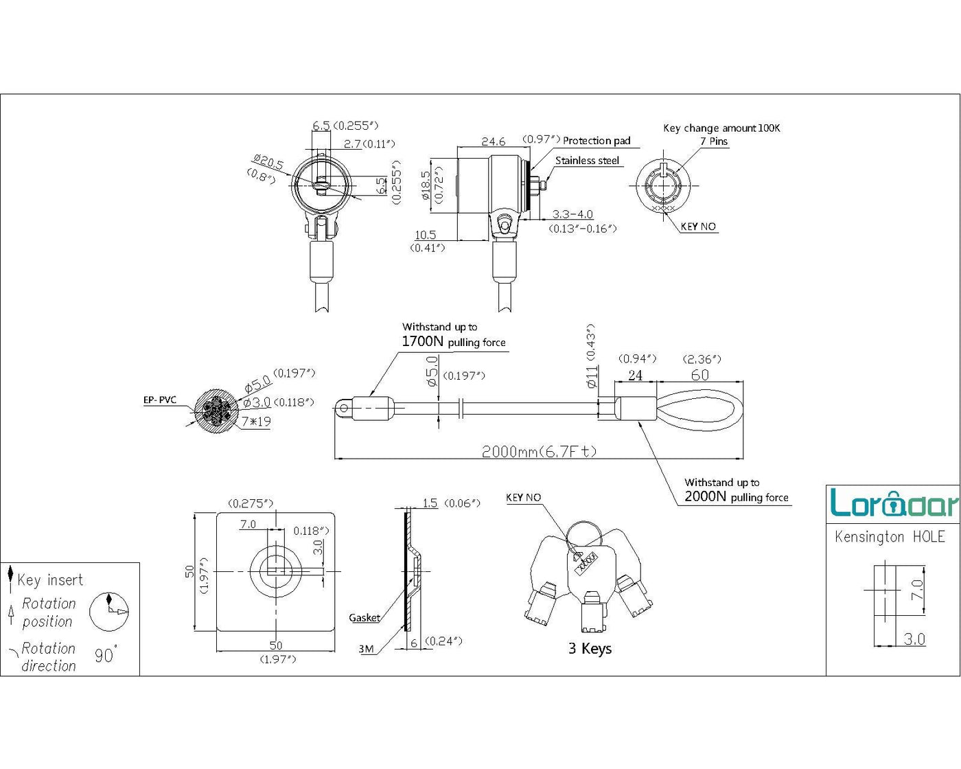 Plate With Keys And Loop The Cable Around A Fixed Object.For Those Laptops With3*7Mm Security Slot Just Simply Insert The Lock Head Into The Slot, And Loop The Cable Around A Fixed Object.100% Reliable And Anti Theft Adopting Super Strong 3M Industrial Adhesive, The Plate Is Very Difficult To Peal Off Once It Is Attached,And The Vertical Load Can Reach 100Lb, Can Effectively Secure Your Devices. Made Of Strong Twisted Steel, The Cable Is Cut Resistant And 100% Reliable.Cable Colour: Black5Pack Weight: 2.4Lbcable Maxsize:6.7Ftlock Size: 18* 23.5 Mmwire Diameter: 5Mmpackage Included:Laptop Cable Lock X5&Nbsp; &Nbsp; &Nbsp; &Nbsp; &Nbsp; &Nbsp; &Nbsp; &Nbsp; &Nbsp; &Nbsp;Lock Anchor X5&Nbsp;&Nbsp; &Nbsp; &Nbsp; &Nbsp; &Nbsp; &Nbsp; &Nbsp; &Nbsp; &Nbsp; &Nbsp;Strong Adhesive X5&Nbsp; &Nbsp; &Nbsp; &Nbsp; &Nbsp; &Nbsp; &Nbsp; &Nbsp; &Nbsp; &Nbsp;Alike Key X5&Nbsp; &Nbsp; &Nbsp; &Nbsp; &Nbsp; &Nbsp; &Nbsp; &Nbsp; &Nbsp; &Nbsp;Warranty:- 12 Months Warranty