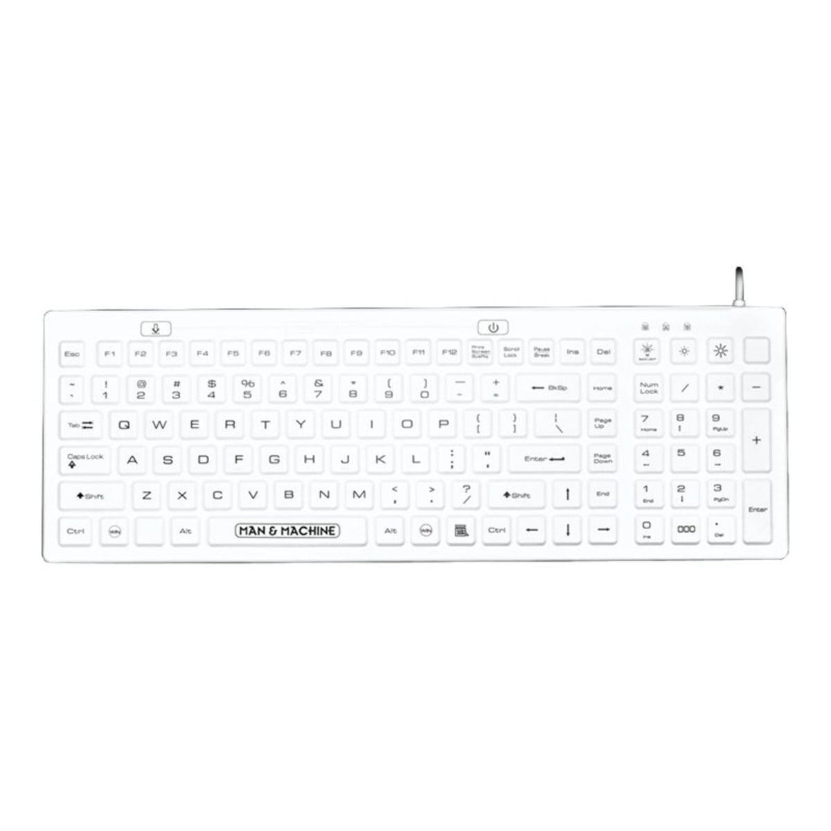 Q: What makes the Man & Machine White DCOOL Backlight Value Keyboard suitable for industrial environments?A: The Man & Machine White DCOOL Backlight Value Keyboard is designed with a full-sized, water-resistant, and sealed silicone construction, making it ideal for industrial environments where spills and contaminants are a concern. Its robust design ensures durability while maintaining functionality.