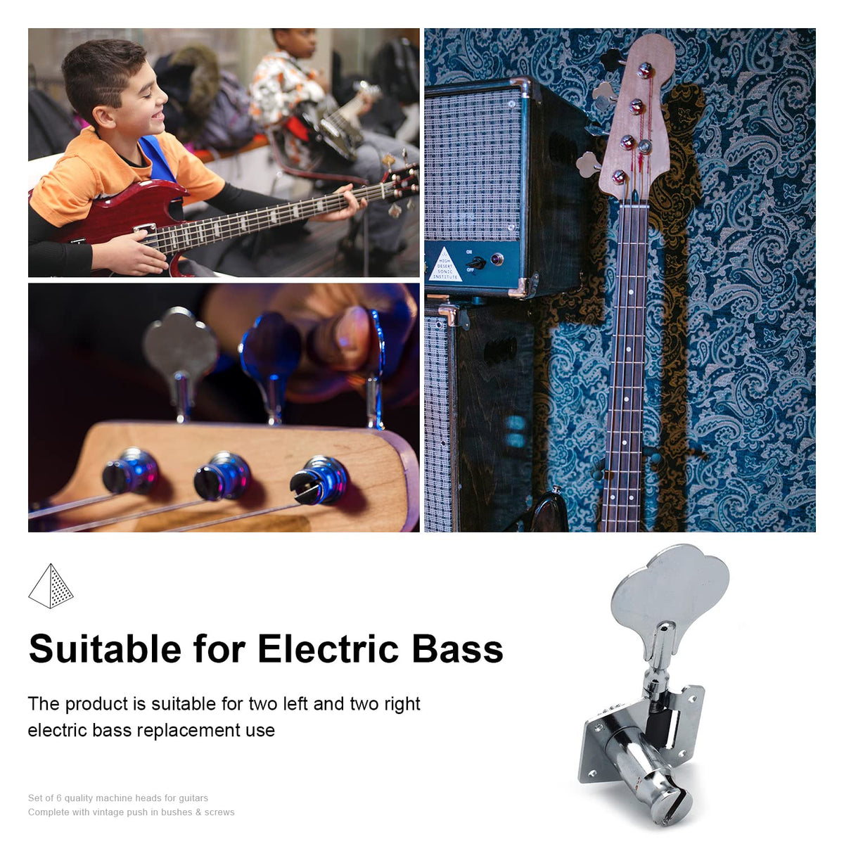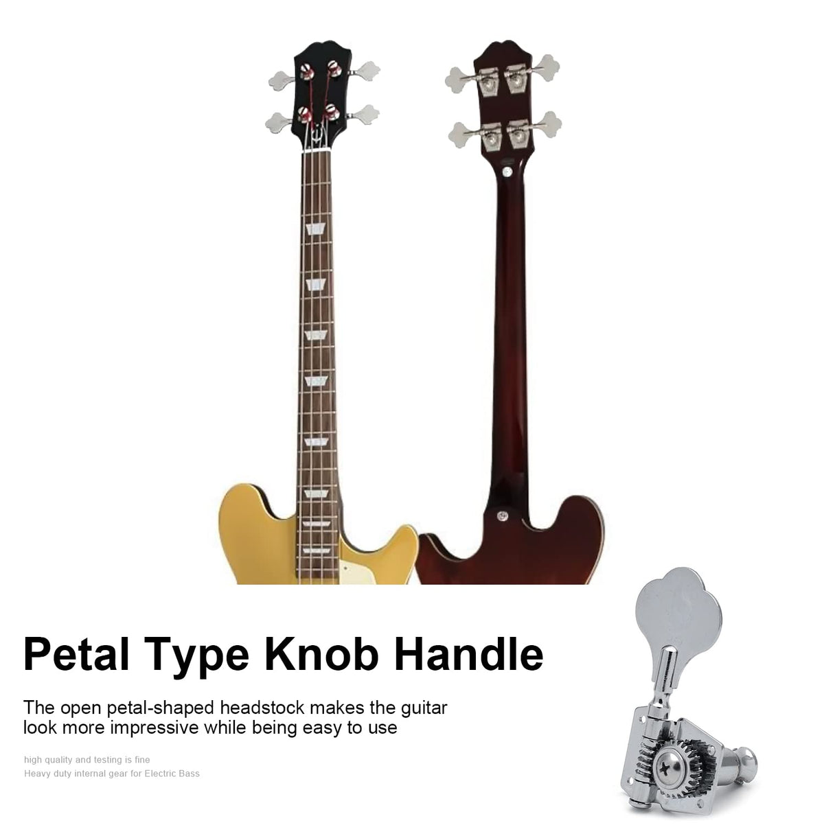 Bass Tuners Specifications: Description: 100% New High Quality And Testing Is Fine Item 100% Like The Picture Shown Heavy Duty Internal Gear Feature: Gear Ratio - 1:24. Smooth Tuning. Modern 14Mm Peg Hole. Comfortable And Easy For Adjustment Of String Tension. Replacement/Upgrade Parts For Electric Bass Or Precision Instruments. Smooth And Shiny, Wear-Resistant, Anti-Corrosion, And Dust-Proof, Quick And Accurate Tuning. Beautiful Plum Blossom Shape Will Make Your Bass More Attractive, Help You Be More Confident In A Bass Show. Provides Finer Tuning And Greater Stability. Complete With Color Matched Threaded Bushings, Washers And Screws. Package Included: 4*Bass Tuning Pegs,16*Screws/4*Ferrules/4*Washers