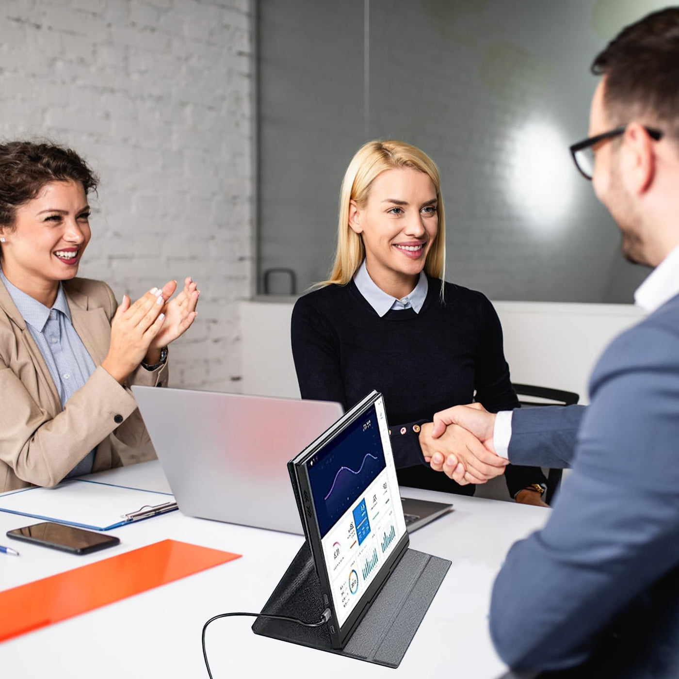 Q: What protective features does the monitor have?A: The moonka Portable Monitor comes with a high-quality PU protective cover that safeguards the screen against scratches and damage. The smart cover also doubles as a stand, allowing for adjustable viewing angles, enhancing convenience during use.