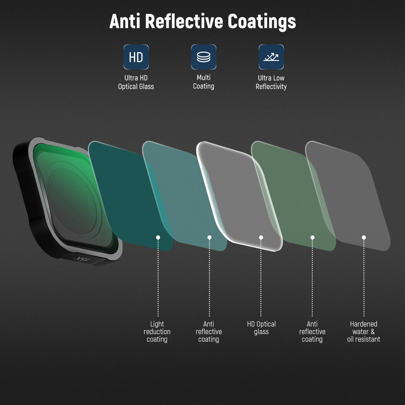 Q: What kind of glass is used in this lens?A: This lens features anti-reflective multi-coated HD optical glass that ensures high clarity in your close-up shots while reducing glare and ghosting.