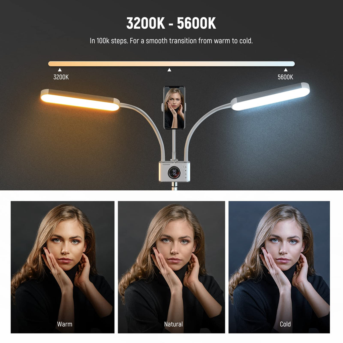 Description: Neewer Bh40B Is A Bi Color Continuous Light, Comes With Two Flexible Tubes That Can Be Adjusted At Any Angle. The Two Light Heads Can Be Controlled Independently Or Simultaneously. Short Press The Knob On The Control Panel To Achieve Separate Control Of L Head Or R Head, Allowing You To Set The Parameters Of The Two Heads Separately. Simultaneous Control Of Two Light Heads Will Keep Their Parameters The Same. Equipped With A 2.4G Remote, Which Allows Remote Wireless Control. Package Also Includes A Light Stand And Phone Holder Compatible With Iphone 14 Pro Max 13 Pro Max 13 Mini X Xr Xs Max Samsung Galaxy Google Pixel Huaiwei Android. The Usb Port On The Control Panel Supports Charging For Your Phone Or Other Devices. Ideal For Live Video And Makeup Tutorials. Ideal For Live Streaming Video And Makeup Tutorials. Specifications Model: Bh40B Color: White Number Of Leds: 210Pcs Input: Dc 15V Output: 5V 2A Max. Power: 36W Max. Illumination: 5200Lx@0.5M Cri: 98+ Brightness Adjustment: 0%-100% Color Temperature Adjustment: 3200K-5600K Channel Number: 0-10 Power Supply Of 2.4G Remote Control: 2 X Aaa Batteries (Not Included) Light Stand Height: 33''-79''/84-200Cmpackage Contents 1 X Bh40B Dual Arm Led Light (Us Plug) 1 X Light Stand 1 X Power Cable 1 X 2.4G Remote Control 1 X Power Adapter 1 X Phone Holder 1 X Bluetooth Shutter 1 X Travel Bag