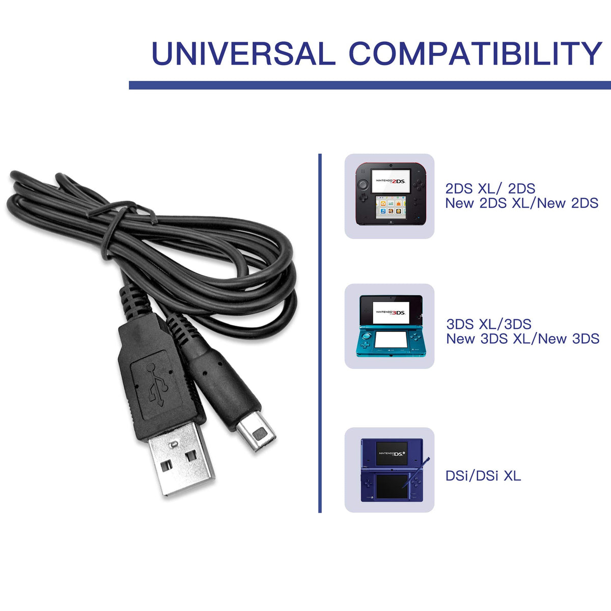 Q: Is the New 3DS XL USB Charger Cable compatible with other Nintendo devices?A: Yes, the New 3DS XL USB Charger Cable is compatible with all devices of 3DS, DSI, and 2DS. However, it is not compatible with Nintendo DS and DS Lite.
