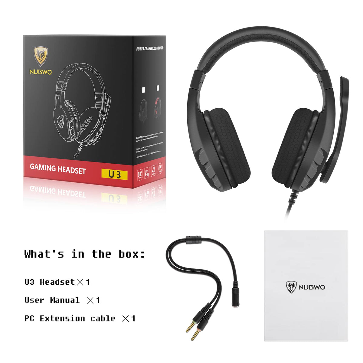 Warranty:12-Month Hassle-Free Warranty And After-Sales Servicemulti-Platform Compatibility: Nubwo U3 Is Compatible With Pc, Xbox One, Ps4, Switch, Wii U And Mobile Devices With Single 3.5Mm Stereo Plug (4 Pole). A Pc Cable With Dual 3.5Mm Headphone And Mic Plugs Is Included, So It'S The Only Headset You Need For Both Pc And Console Gaming.Noise-Canceling Microphoneomnidirectional Microphone Offers Clearer Voice Quality And Reduced Background Noise For Better In-Game Chats.Superior Audio Performance50Mm High Definition Speakers Deliver Incredibly Clear Highs And Deep, Rich Bass. Hear Every Detail In Immersive Sound.Specification:Driver Diameter: ?50Mmsensitivity: 953Dbimpedance: 32?15?Frequency Range: 20~20000 Hzmic Dimension: ?6.0X5.0Mmmic Sensitivity: -383Dbmic Impedance: 2.2K?Plug:3.5Mm (Ctia Standard)Package Contents: Nubwo U3 Gaming Headset 1User Manual 1Pc Extension Cable 1