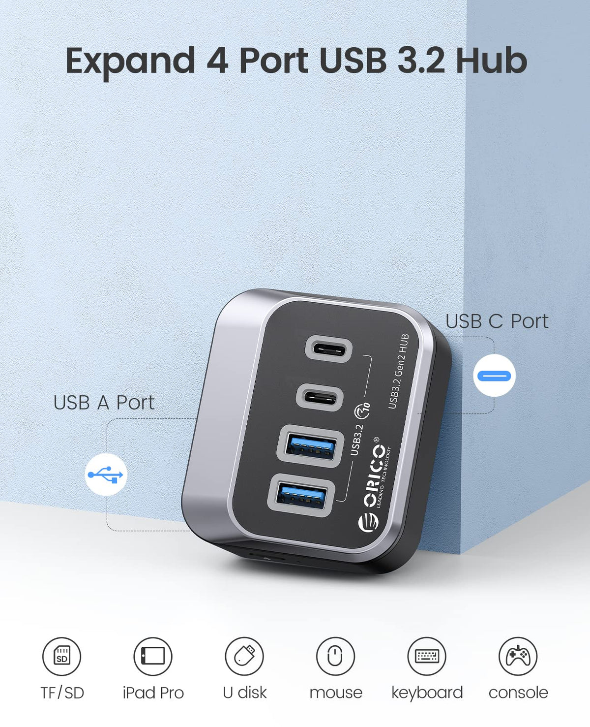 ORICO USB Hub 10Gbps with 2 USB A Ports+2 USB C Ports, USB 3.2 Gen 2 Hub with 1.64Ft USB C Cable and USB A Adapter USB Splitter for iMac, All MacBooks, Mac Mini