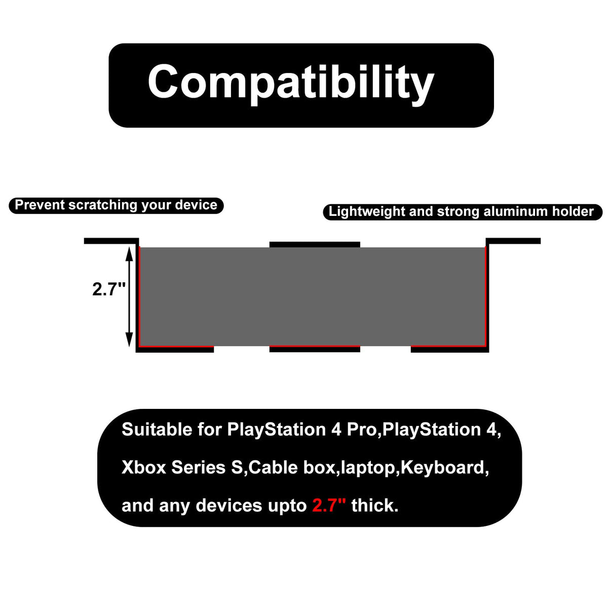 Q: What devices can the PIAOLGYI Under Desk Laptop Holder Mount support?A: The PIAOLGYI Under Desk Laptop Holder Mount is designed to accommodate devices up to 2.7 inches thick, including popular gaming consoles like PlayStation 4, PlayStation 4 Pro, Xbox Series S, Xbox One S, as well as laptops and cable boxes.