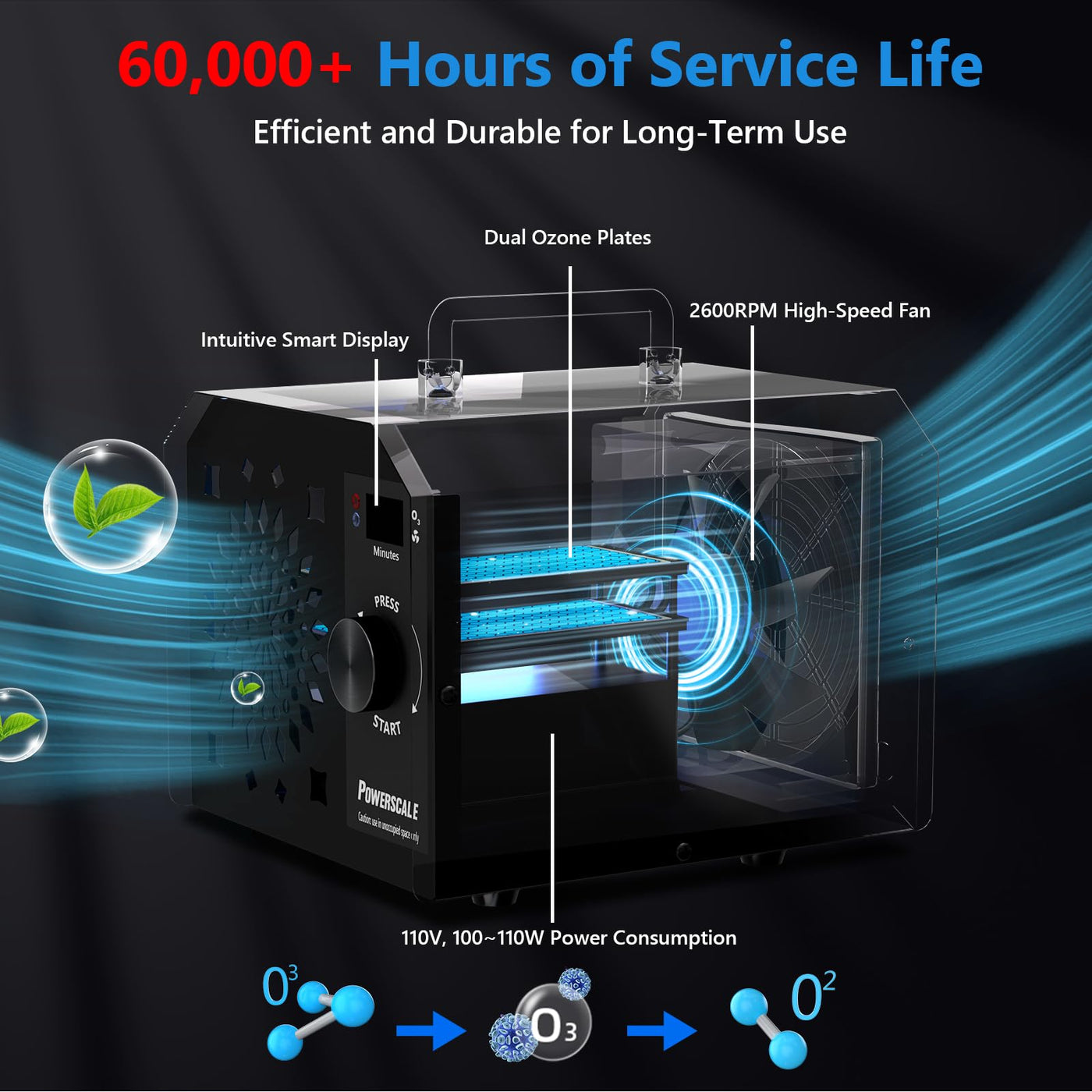 Q: Is the Powerscale ozone generator safe to use?A: Yes, this ozone generator includes a 10-second safety delay to ensure safe exit before operation begins and features automatic post-cycle ventilation to clear the air, ensuring compliance with CE, EPA, and FCC safety standards.