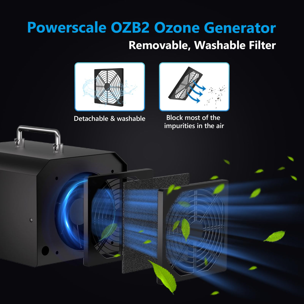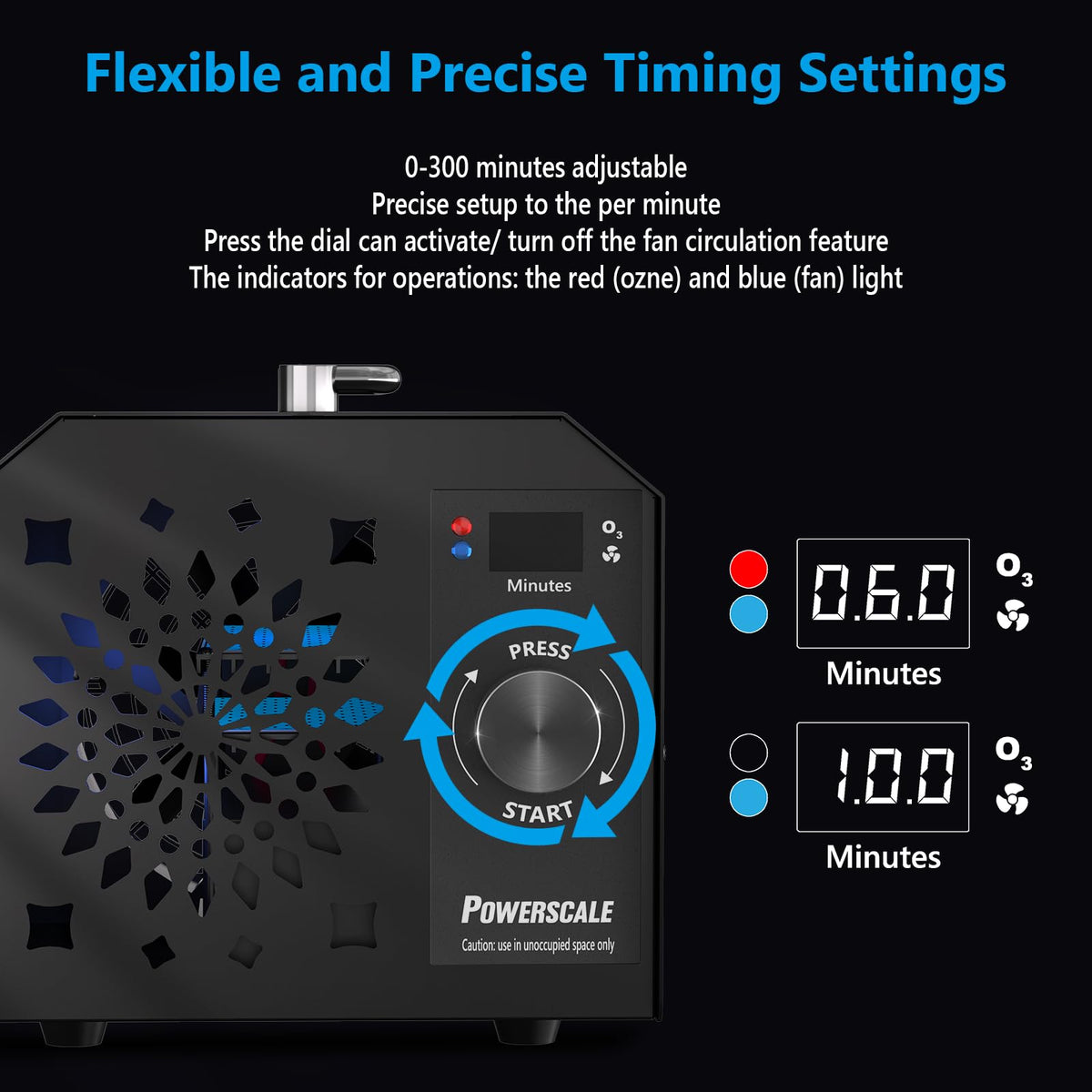 Q: How do I operate the digital controls on this ozone machine?A: The Powerscale OZB2 features an intuitive smart knob and LCD display that allows you to easily set the desired runtime and monitor air quality, providing minute-by-minute control for precise operation.