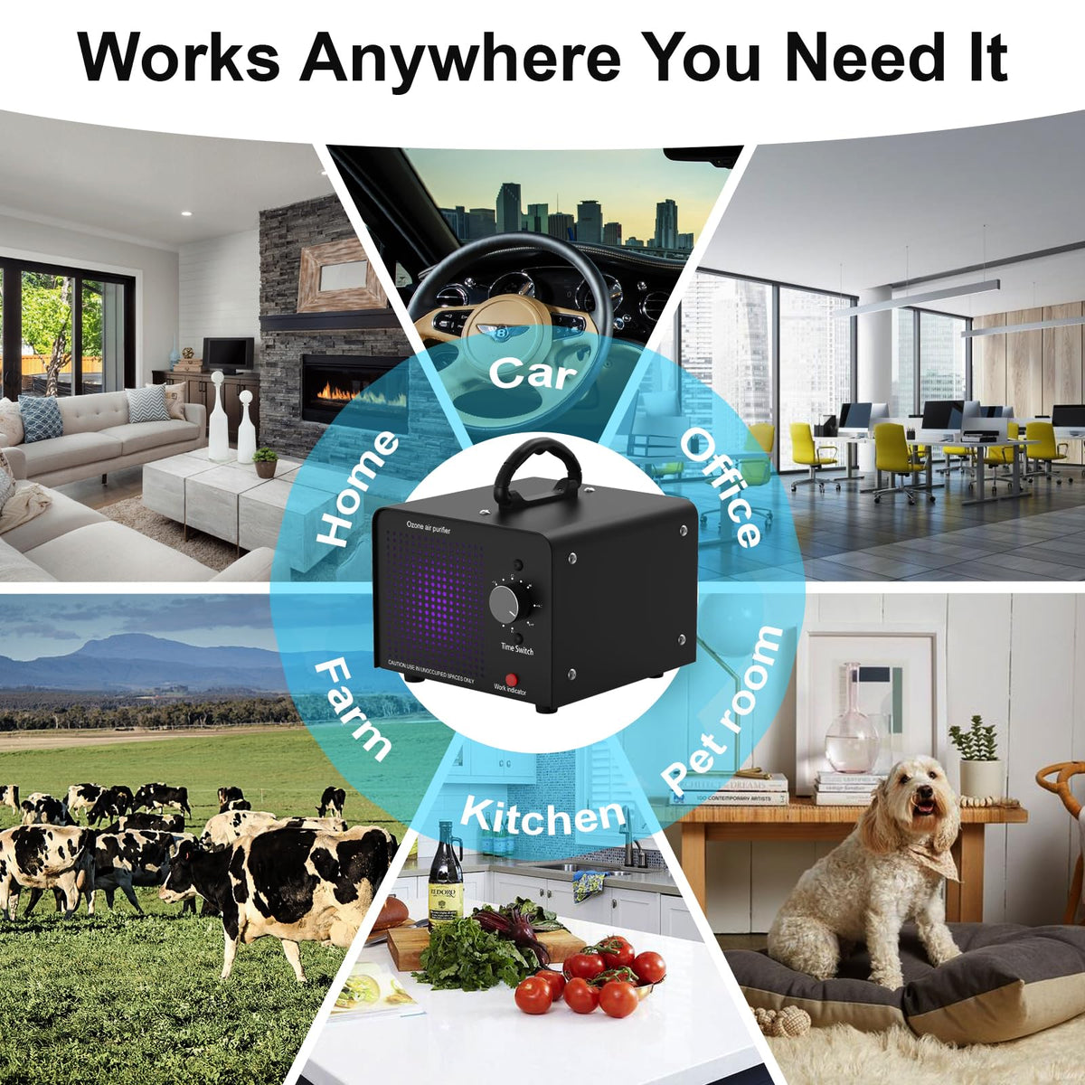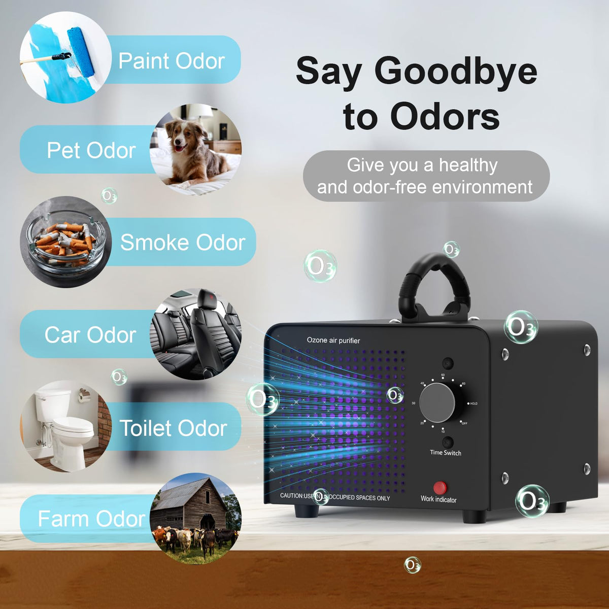 Q: How do I operate the ozone generator?A: Operating the PROGRACE Ozone Generator is straightforward. Simply set the adjustable timer between 0-60 minutes, and the machine will automatically shut off once the set time is complete, ensuring efficient odor neutralization and air purification.