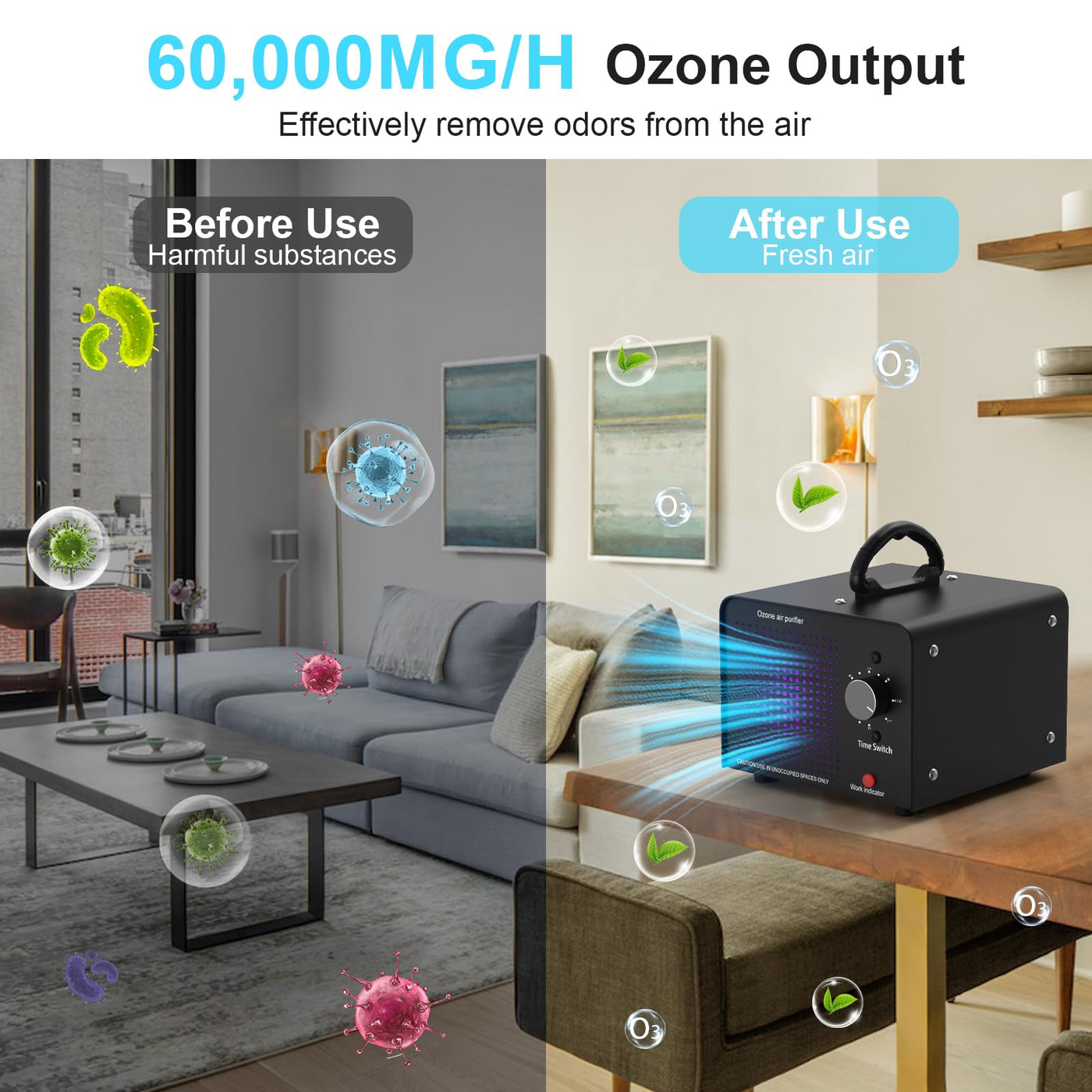Experience The Power Of Efficient Air Purification With Our 60G/H Ozone Generator. This High-Performance Ozone Machine Is Designed To Remove Persistent Odors Caused By Pets, Smoke, Mildew, And Other Pollutants, Making It Ideal For Use In Homes, Cars, Basements, And Commercial Spaces. With Its Impressive 60G/H Ozone Output, This Odor Eliminator Is Perfect For Tackling Strong Odors In Large Areas. It Works Effectively As A Pet Odor Eliminator For Homes Or A Smoke Odor Remover In Enclosed Spaces, Providing Fresh And Clean Air Wherever It'S Used. Key Features: Powerful Ozone Generation: Produces 60G/H Of Ozone To Effectively Eliminate Strong Odors In Homes, Cars, Basements, And More. Versatile Use: Suitable For Offices, Gyms, Restaurants, And Residential Areas, This Ozone Machine Purifies Air In Various Environments. Safe & Easy Operation: Features A 0-60 Minute Timer. After Use, Ventilate The Room For At Least 30 Minutes Before Re-Entering The Space. Durable & Portable: Built With A Strong All-Metal Shell And Designed For Portability, Making It Convenient To Move Between Rooms Or Locations. Please Note: This Product Is Not For Sale In California Due To State Regulations. After The Ozone Generation Process, Always Ventilate The Room For At Least 30 Minutes Before Re-Entry. Technical Specifications: Ozone Output: 60G/H Input Voltage: 110V/60Hz Power: 100W 5W Cooling System: Air Fan Cooling Timer Control: 0-60 Minute Adjustable Timer Function: Sterilization/Disinfection Certifications: Fcc, Ukca, Rohs, Ce,Epa Made In China Not For Sale In California.