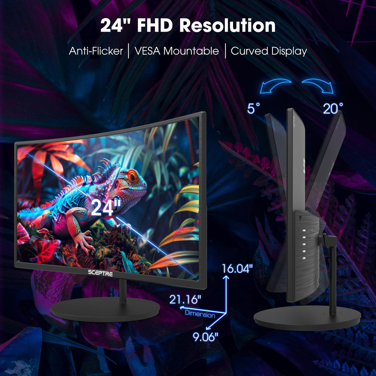 Sceptre 24 Inch Curved 100Hz Gaming Monitor Hdmi X2 Vga 100% Srgb Eye Care, Build In Speakers Machine Black 2024 (C248W 1920Rnr