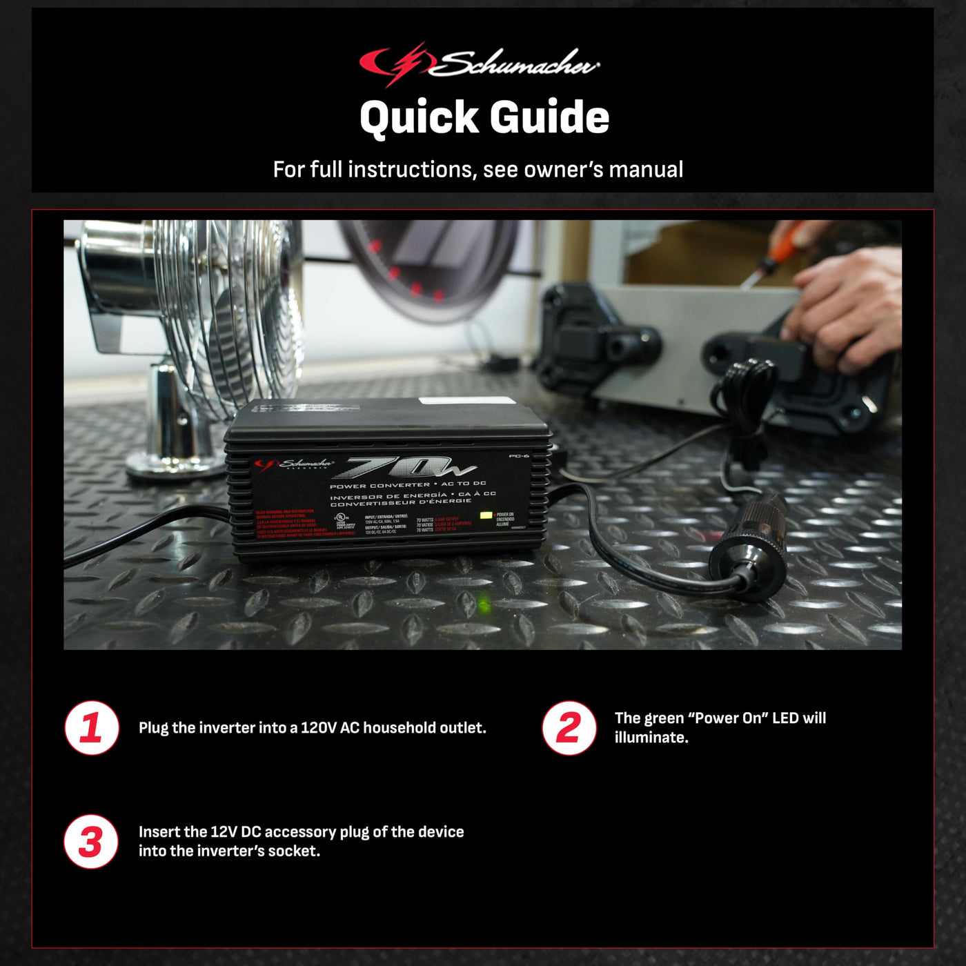 The Schumacher Ac To Dc Power Converter Converts 70 Watts Continuous/140 Peak Watts Ac To 12 Volt Dc Power, So You Can Use Your 12 Volt Products With Ac Anywhere - At Home, At The Office, Or In Hotels. Schumacher'S 12 Volt Products Provide The Comforts And Convenience Required By The Professional Drivers And Travelers Of Today. Includes A Simplified, Easy-To-Use Design With An On/Off Switch, Led Indicator Light, And Built-In Plug And Port.