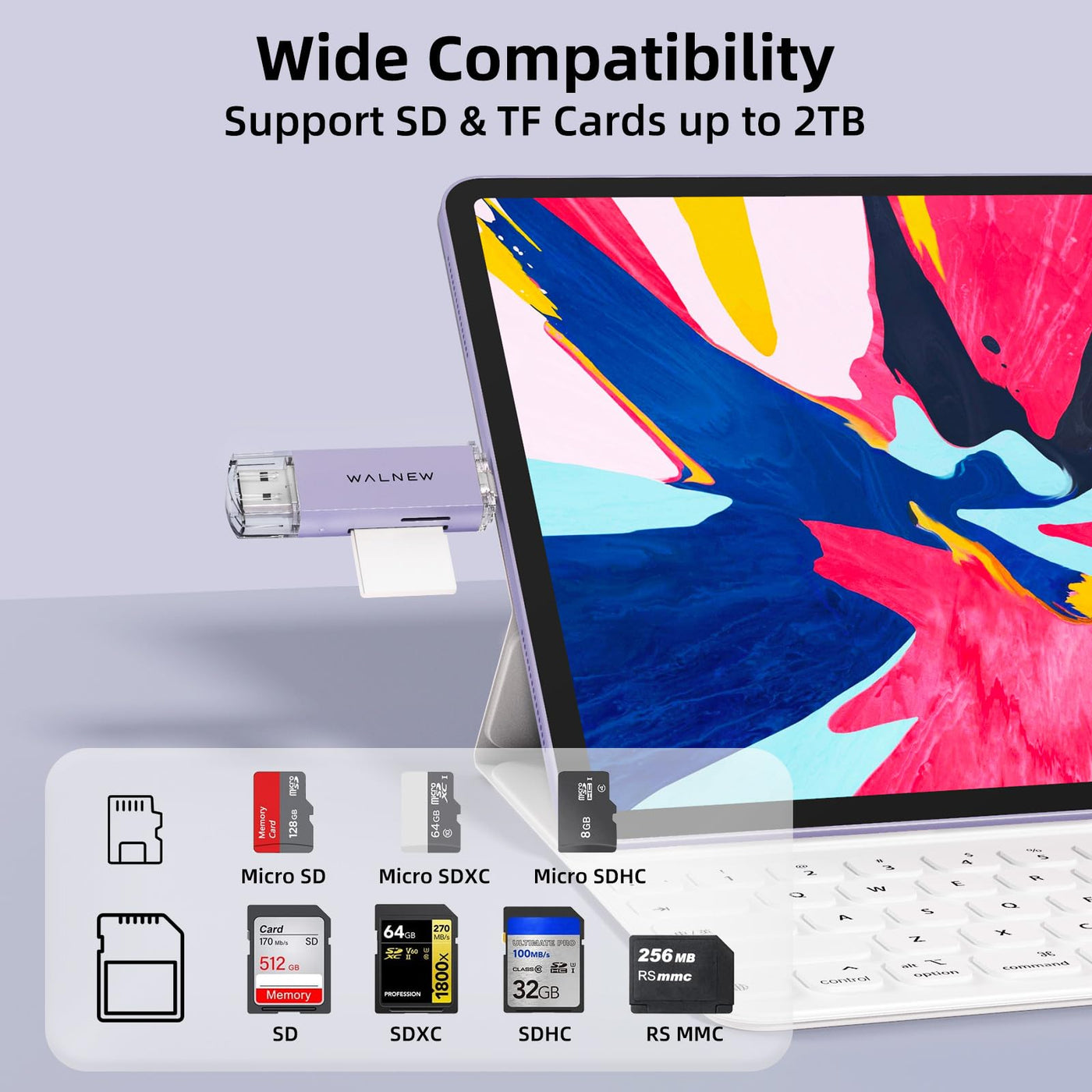 Q: What devices are compatible with the WALNEW USB C SD Card Reader?A: The WALNEW USB C SD Card Reader is compatible with a wide range of devices including MacBook Air, MacBook Pro, iMac, iPad Pro, Samsung Galaxy smartphones, and various Windows laptops such as Dell XPS and Microsoft Surface models. It also supports OTG devices, allowing for seamless file transfers.
