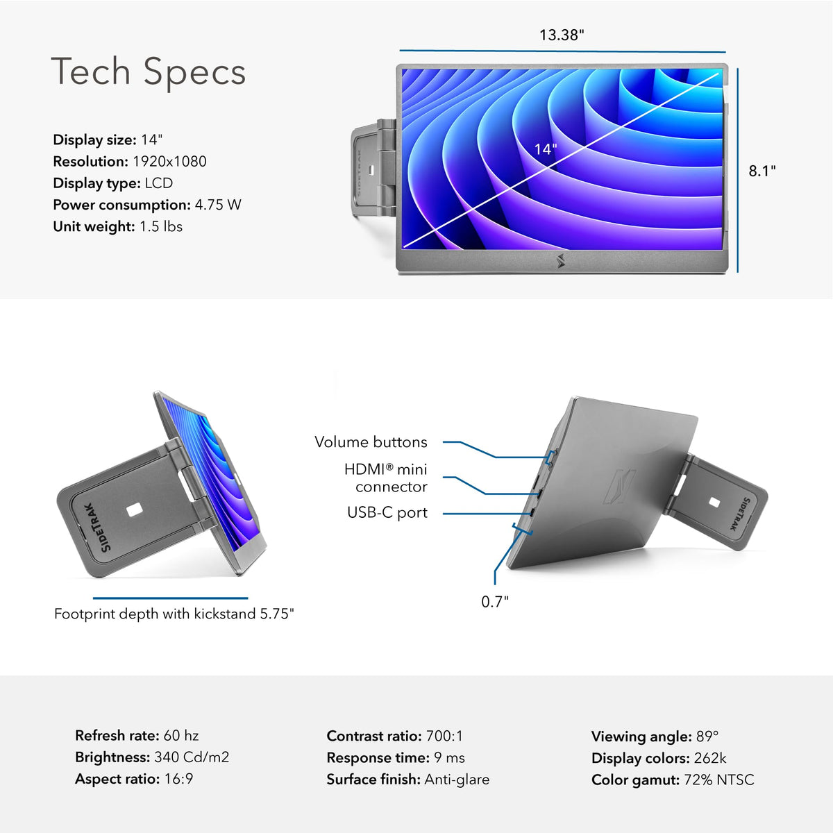 Q: What is the size and weight of the SideTrak Swivel portable monitor?A: The SideTrak Swivel portable monitor measures 13.38" x 0.7" x 8.1" and is designed to be lightweight and compact, making it easy to carry and ideal for on-the-go productivity.