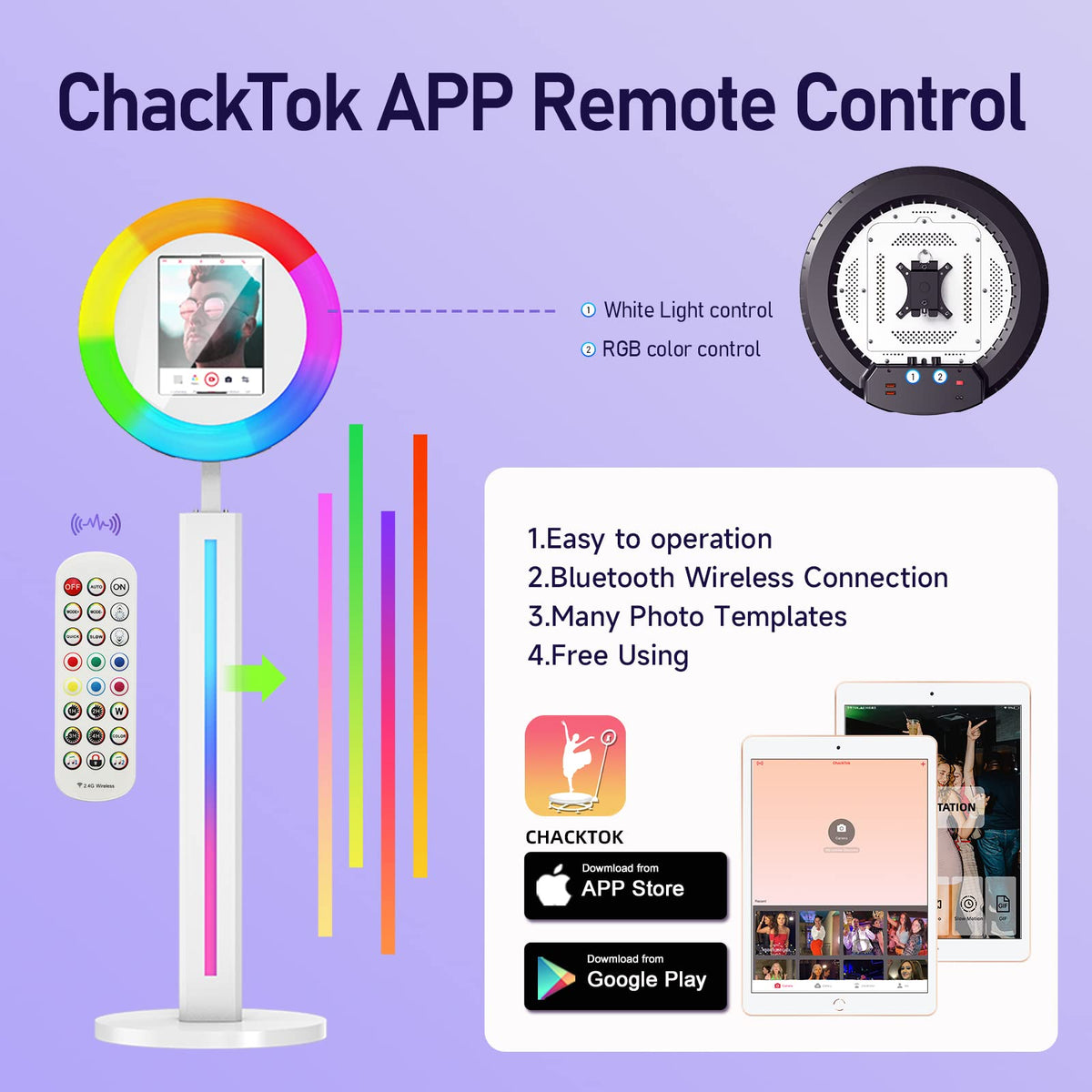 Q: How does the RGB ring light work with this photo booth?A: The RGB ring light included with the photo booth features over 20 color lighting modes, with adjustable brightness from 1% to 100%. You can control the light through a button or the CHACKTOK app, and it even syncs with music to create dynamic lighting effects.