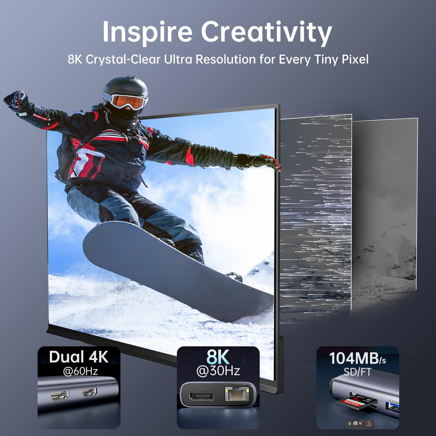 ?8K Hdmi+Dp?This Thunderbolt Usb C Displayport Hub Features Dual Hdmi And Dp Ports With An Ultra Chip That Supports 8K30Hz. Thunderbolt 4 Dock Backward Compatible With 4K60Hz, 4K30Hz, 2K60Hz, And 1080P120Hz, Allowing You To Mirror Or Extend Your Screen To A Monitor, Projector, Or Hdtv At Crystal-Clear Resolution.