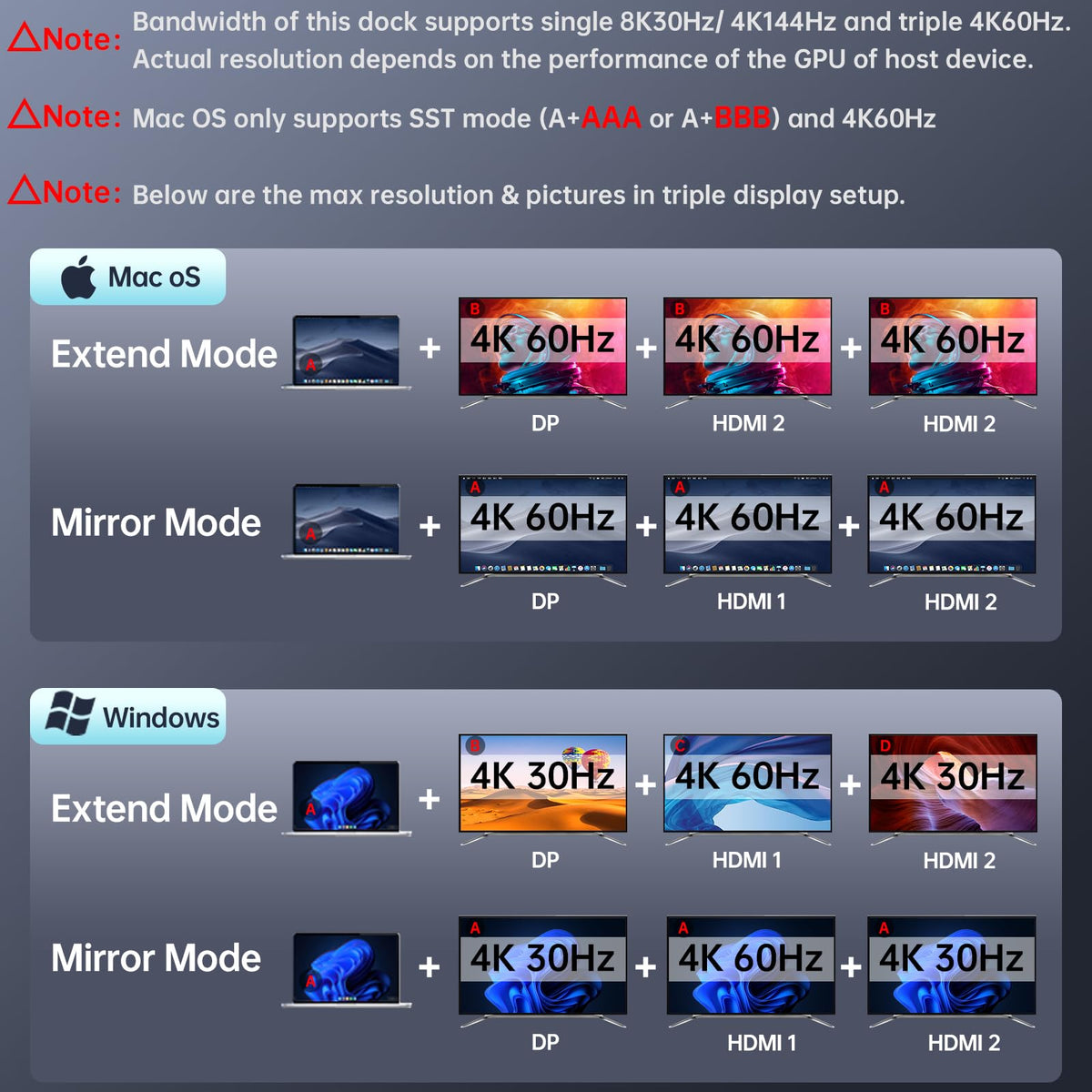 ?Triple Display?This Thunderbolt Usb-C Docking Station Supports Three Monitors With A Maximum Resolution Of 4K60Hz In Extend Mode. The Actual Resolution Depends On The Performance Of The Host Pc'S Graphic Card (Gpu). It'S Important To Note That Due To Apple'S Limitation, Mac Os Doesn'T Support Extending Mode, And Consequently, All External Screens Will Be The Same In Sst Mode (A+Aaa Or A+Bbbb).
