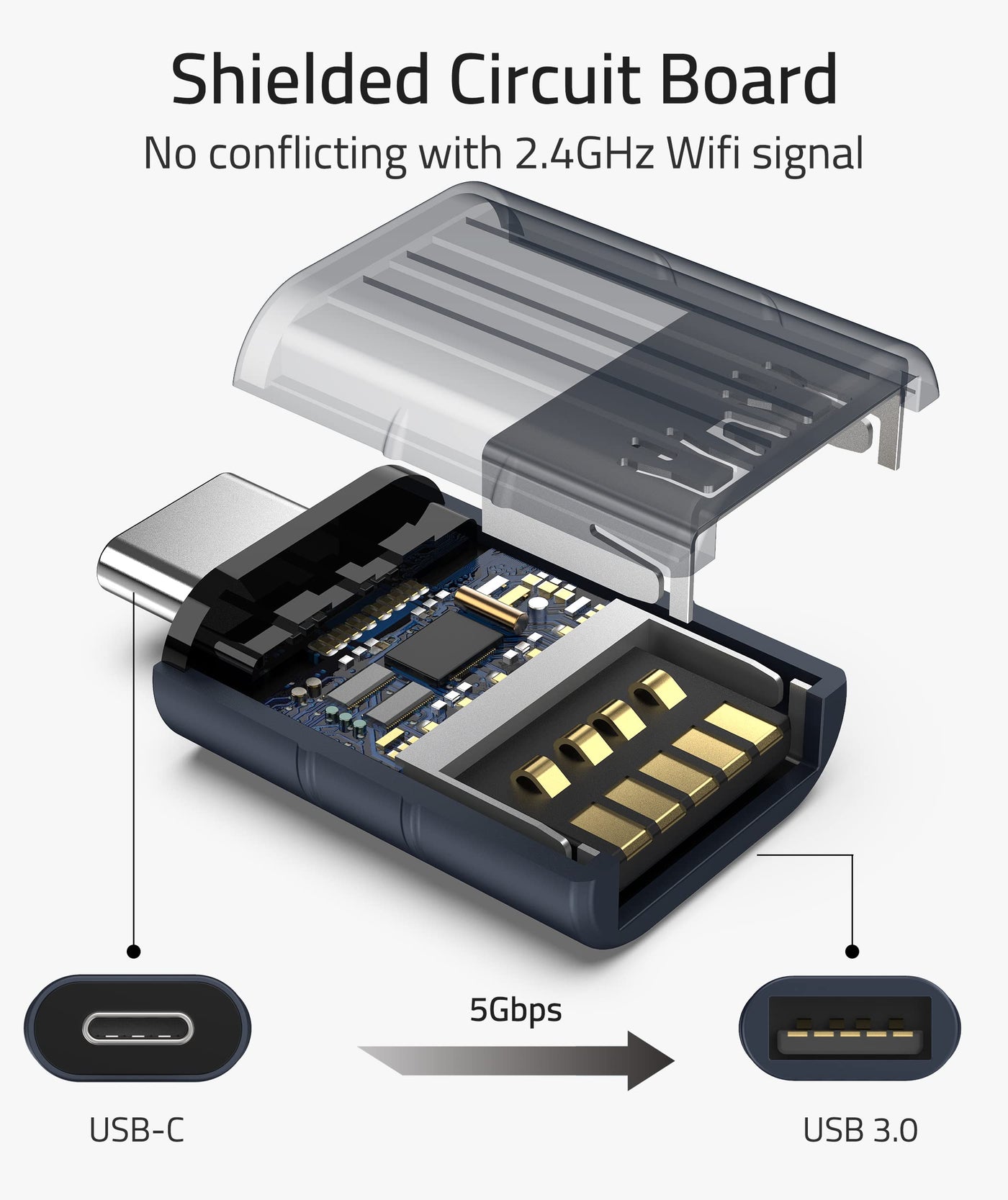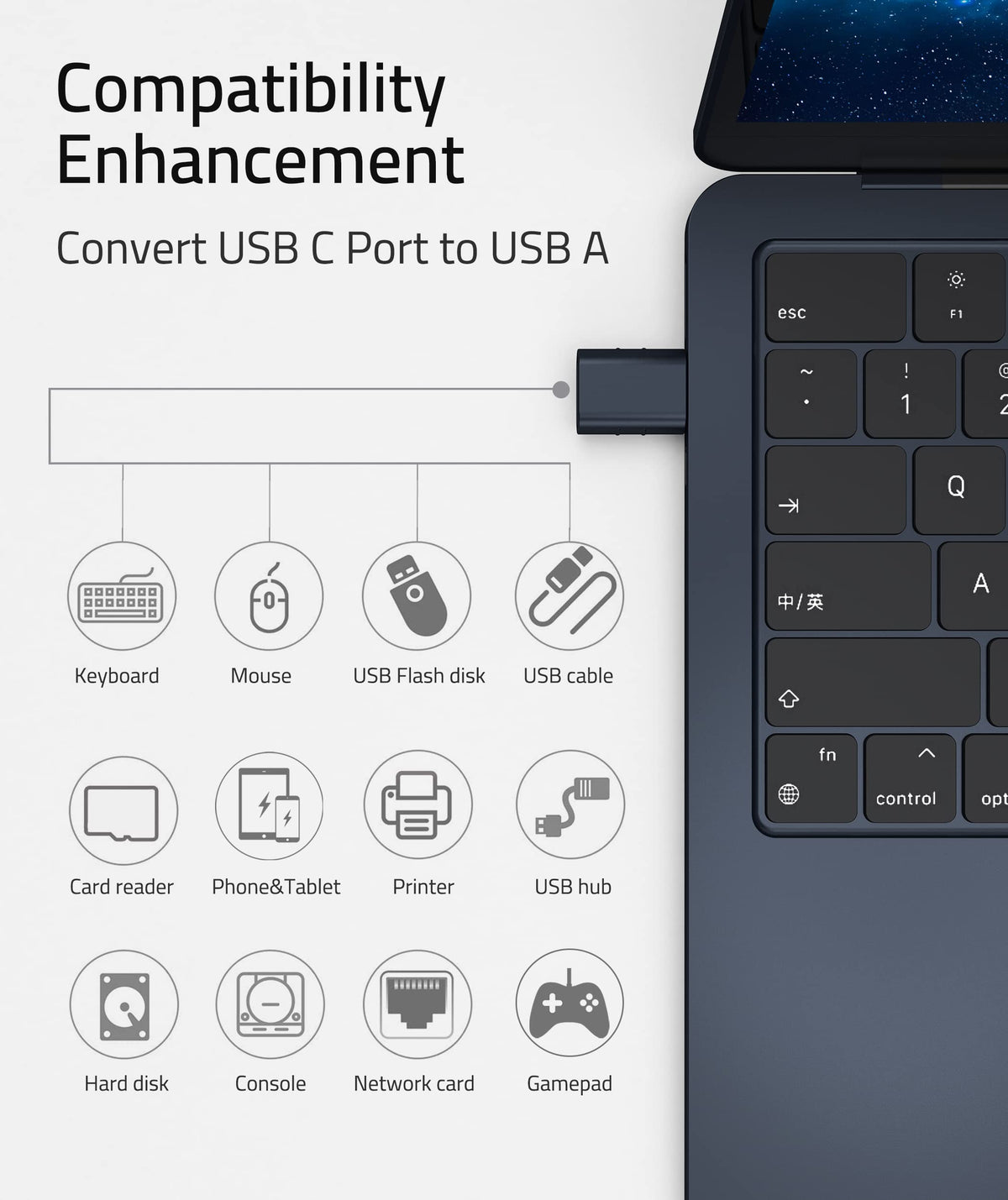 Q: What devices are compatible with the Syntech USB C to USB Adapter?A: The Syntech USB C to USB Adapter is compatible with a wide range of devices including the iPhone 16 series (16, 16 Plus, 16 Pro, 16 Pro Max), MacBook Pro (after 2016), MacBook Air (after 2018), and most laptops, tablets, and smartphones featuring a USB Type C port.