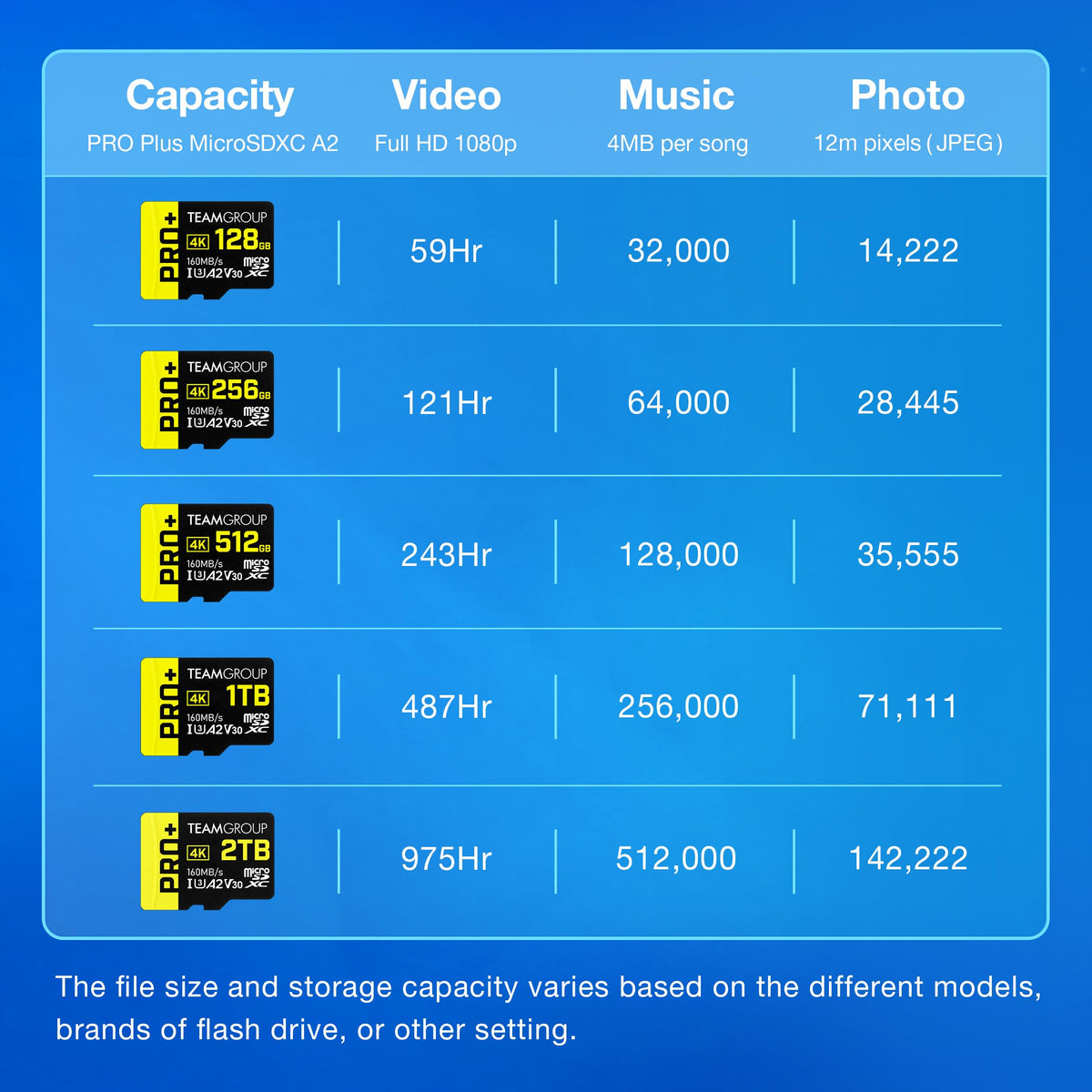 Teamgroup Pro+ A2 Memory Card Supports Uhs-1 Speed Class 3 (U3) And Video Speed Class V30, Features Read/Write Speeds Of Up To 160Mb/S And 110 Mb/S, And Complies With Application Performance Class 2 (A2). It Boasts Superior Read/Write Speed Performance And A Maximum Storage Capacity Of 1Tb. Moreover, It Comes With A Lifetime Warranty And Has Been Through Rigorous Experiments And Testing. It Is Waterproof, Dustproof, Shockproof, Anti-Static, X-Ray-Proof, And Resistant To High And Low Temperatures.