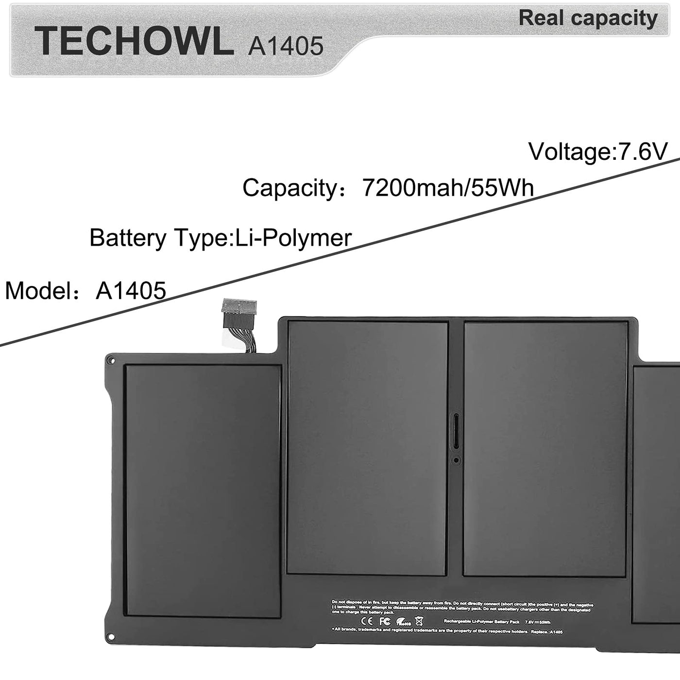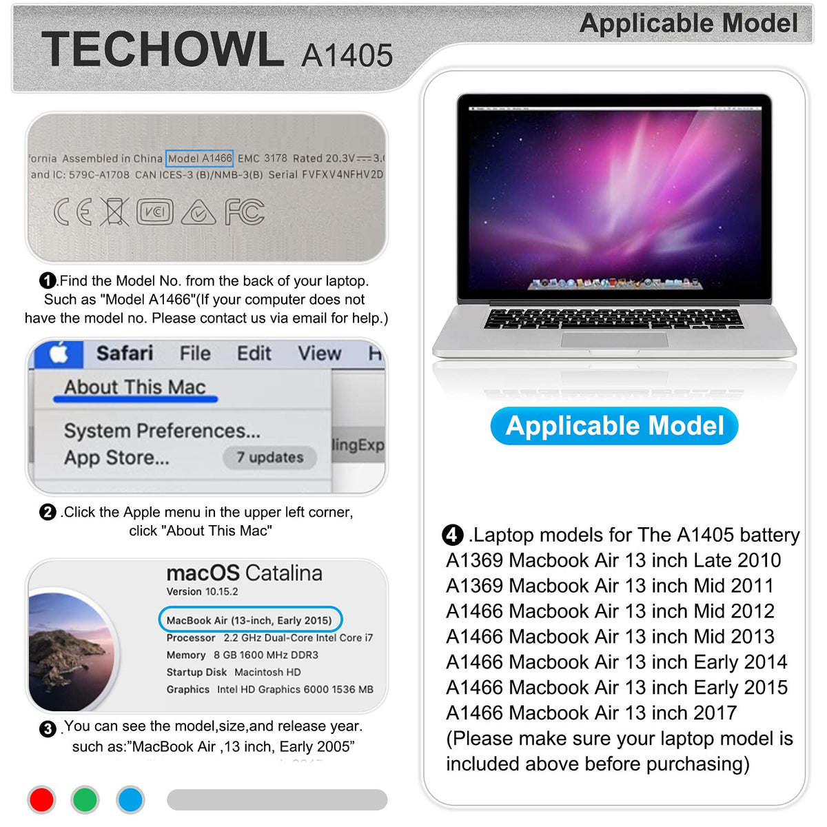Specifications: Type:Li-Polymer&Nbsp; Voltage: 7.6V Capacity: 55Wh/ 7200Mah Cell:4-Cell. Before Purchasing: Please Make Sure That This Battery Is Suitable For Your Laptop. If You Can'T Confirm, Please Contact Customer Service Via Email. Applicable To Mac Models: A1369, Macbook Air, 13-Inch, Late 2010 A1369, Macbook Air, 13-Inch, Mid 2011 A1466, Macbook Air, 13-Inch, Mid 2012 A1466, Macbook Air, 13-Inch, Mid 2013 A1466, Macbook Air, 13-Inch, Early 2014 A1466, Macbook Air, 13-Inch, Early 2015 A1466, Macbook Air, 13-Inch, 2017 Model Identifier: Macbookair7,2&Nbsp; &Nbsp; Macbookair4,2 Macbookair6,2&Nbsp; &Nbsp; Macbookair3,2 Macbookair5,2&Nbsp; (You Can See The Model Identifier From The ''Hardware Overview'') Emc :&Nbsp; 2469, 2559, 2392, 2632, 2925, 3178. Note: 1.Using The Battery For The First Time, Calibrate Your Newly Installed Battery First: Charge It To 100%, And Keep Charging It For At Least 2 More Hours. Unplug And Use It Normally To Drain The Battery. When You See The Low Battery Warning, Save Your Work, And Keep Your Laptop On Until It Goes To Sleep Due To The Low Battery. Wait At Least 5 Hours, Then Charge Your Laptop Uninterrupted To 100%. 2. F You Notice Any Unusual Behavior Or Problems After Installing Your New Battery, You May Need To Reset Your Macbook Pro'S Smc. 3.On Daily Use, Please Recharge Immediately When The Battery Reduced To 5%. 4.If You Remove The Battery For A Long Time, Charge More Than 80% At Least One Time Within One Month.5.If You Encounter An Unsolvable Problem, Please Find Customer Service For Help Via Email.